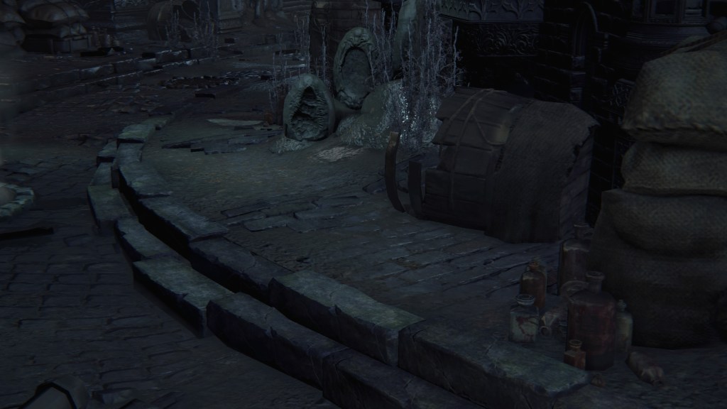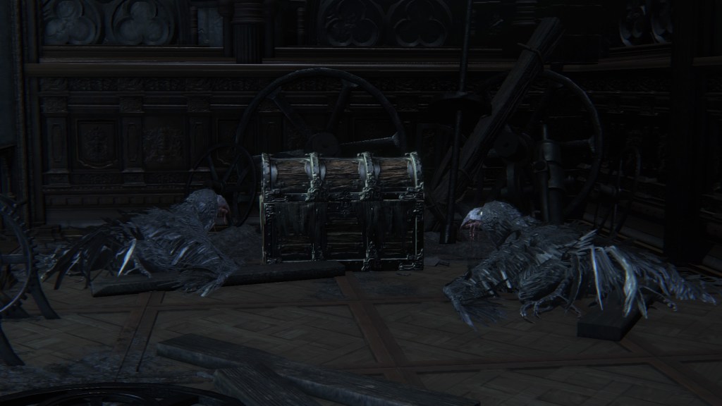 This knock-on effect on other experiments extended closer to the Research Hall as well. One small corner on the Research Hall’s sixth floor serves as a freighting platform, winches ready to haul up large supplies from the bottom level and then transport them to the floors in-between; easier than lugging them up the stairs. And on that platform, surrounded by ravenous carrion crows from the rafters, is a chest containing a finestrike damp bloodgem enhancing visceral attacks, useful for those hoping to dig deeper into the viscera — like the researchers there. Another chest on the balcony overlooking the Grand Cathedral below contains a pulsing damp bloodgem offering continual HP recovery, helpful for those trying to keep blood pulsating for as long as possible — like the researchers there. Experimenting on the patients with water netted the Healing Church some excellent aid to their existing work.