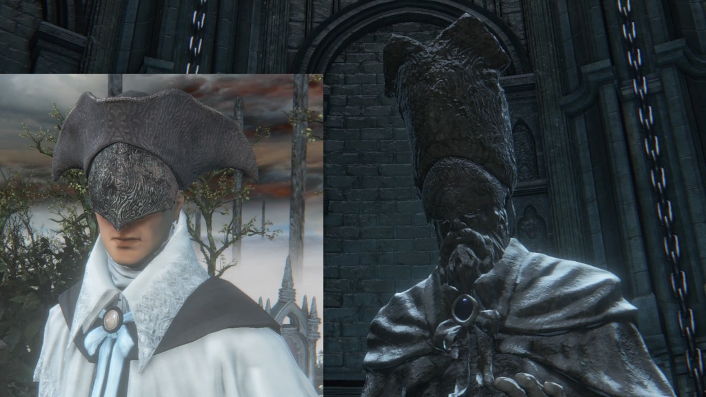 Such precautions were to be expected of students hoping to honor their teacher’s adage, but the dangers meant that their fear of blood needed to go the step further. Roles were therefore assigned to the ranks. Clerics in white were the superiors to the clerics in black, so the former took precedence in experiments. Because this seniority made them experts in the disease, these blood ministers were best suited to teaching the neophytes the proper approach to this hands-on research. This explains why the surgery altar’s central masked figure — sporting a beard suspiciously similar to Laurence’s Cainhurst portrait — has such a tall hat more comparable to Willem than the church’s top level. It was Laurence leading the founders’ experiments, with everyone else who joined later becoming their assistants, and so on. He set the example to stay true to his promise, letting newcomers slowly gain the experience to trade in their vulgar black uniforms for enlightened white. It was all to instill fear of the blood.