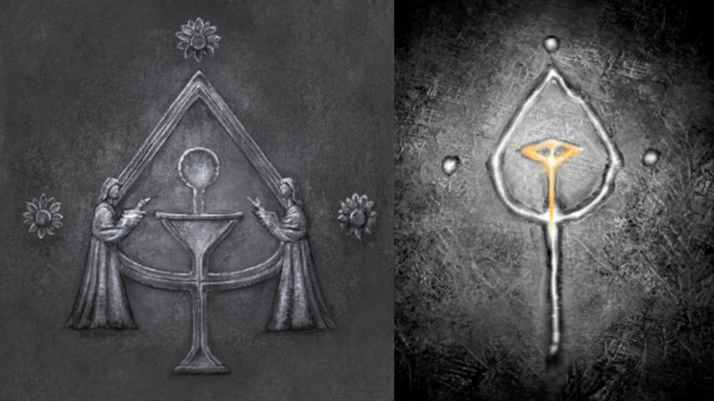 As the Healing Church’s operations shifted atop the valley with continued expansion, the new district built a “great church” (大聖堂) to serve as its seat of power. Safely nestled in the deepest reaches of the Ward named after it, this Grand Cathedral’s altar enshrines the blood used for treatment, labeled the Eucharist in allusion to Roman Catholicism — though the literal term “Holy Body” (聖体) does seem to conflate blood with flesh, the kanji for “body” can denote a physical substance in general, and blood is still arguably part of the body. This highlights the Grand Cathedral’s central practice: delivering the blood of gods to the faithful. Indeed, the rune for Communion — or “Receive” (拝領) in reference to the phrase “receive the Eucharist” (聖体を拝領する) — has been the symbol of the Healing Church since its inception; a chest contains the rune at the church workshop. To add to this, depictions of the rune on the cathedral’s main gate picture blood being poured into a chalice while robed onlookers raise their arms in praise, which complements the statues surrounding the actual blood on the altar.