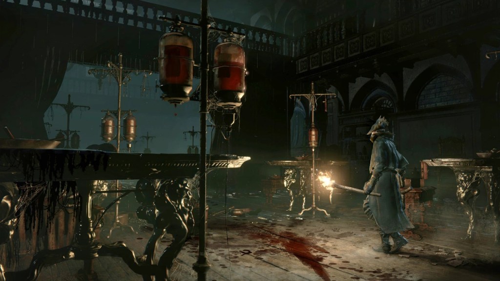 It doesn’t come as a surprise then to see the Grand Cathedral dungeon imprison hunters. Most are dead with frenzied coldblood, the other standard cells locking away minds which have gone violent or are barely holding together. These hunters have been slowly going mad, and the reason why is obvious from the dungen’s exit — a coffin amongst the cathedral’s graves slid back to reveal the staircase, decorated with an ill man on top. The prisoners are suffering the initial symptoms of beasthood, each already considered dead and buried to the Healing Church as they slowly go mad resisting the devolution. Some were brought up to study before transformation; we find a church servant guiding a researcher through the cells, with the Research Hall hiding the corpses of a bloathead carrying the keys in the patient room wing and a hunter wearing old decorative attire in the laboratory wing. The rest were left to rot and, hopefully, put down before fully degenerating into beasts.