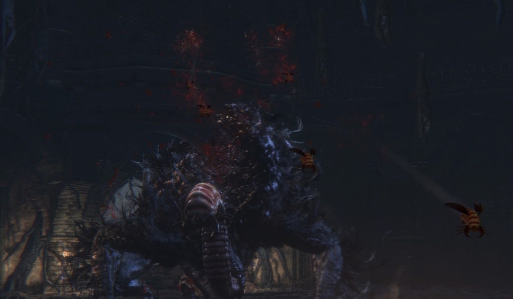 As to why turn their leader into the source for blood treatment, the obvious answer would be its greater potency even compared to the gods’ blood. We see this manifest in his living form: the Bloodletting Beast. This incredibly large and terrifying boss is more accurately named the “Owner of the Beast Blood”, (獣血の主) a pointless name if not referring to the beast blood enshrined in the Grand Cathedral. Likewise, the boss is internally named “Founder Beast” (始祖ビースト) in clear reference to Laurence’s foundational role in the Healing Church. Moreover, the scar on the Bloodletting Beast’s face is found on the altar skull. The boss is also only enemy to have a headless variant, which continues to operate thanks to the parasites generating in its blood — as the fight progresses, the centipedes will sprout from his open wounds, including the head; one of the beast’s attacks even shoots blood in the form of stout centipedes with wings. These insects inflict the rapid poison status like in other instances, affirming the corruption of the beast’s blood. And this corrupted blood belongs to Laurence.