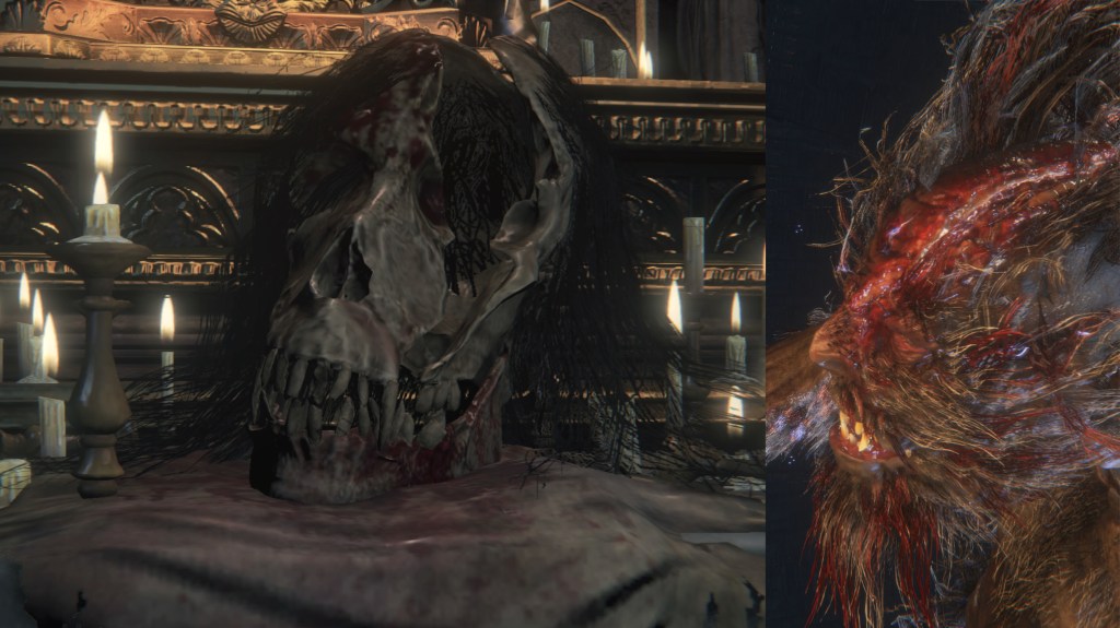 Alas, not for Laurence. He became the first cleric beast, never to fulfill his promise and return to Gehrman. In fact, someone has long since taken his head, as the beast skull resting on the Grand Cathedral altar belongs to the Vicar. Touching the skull, of course, grants us a vision of Laurence’s memory, and his human skull in the Hunter’s Nightmare rests in the same spot as the beast skull on the Second Grand Cathedral’s altar. The altar also features a fancy chair above the tabernacle in obvious reference to the Throne of St. Peter, first leader of the Roman Catholic Church — the altar chair even sat a human skull with a king’s crown in a leaked alpha trailer, which concept art renders as Laurence’s beast skull. With Miyazaki practically saying as much in the Future Press interview, there is no reason to doubt that Healing Church enshrined the first Vicar’s severed head, the blood it contained replacing the Great One blood in the tabernacle. As the description for Beast’s Embrace acknowledges, the forbidden rune we acquire from defeating Laurence ironically became a foundation for the Church.