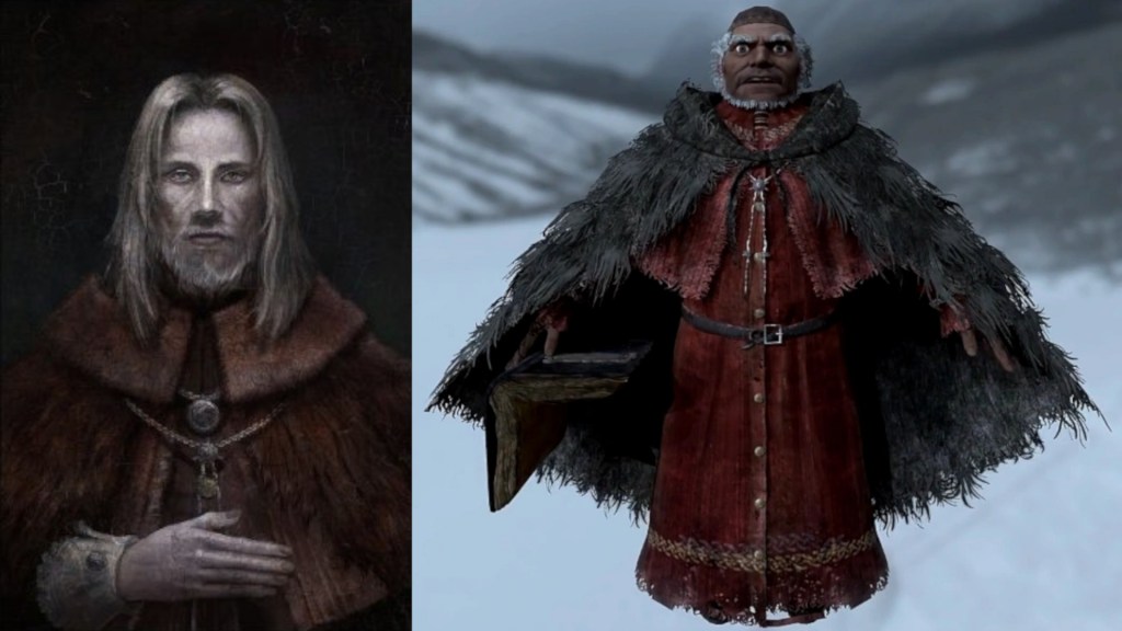 Among the portraits hanging in Castle Cainhurst, one stands out as peculiar. One might be forgiven for overlooking the figure as just another noble with his pale skin and silvery hair, not to mention attire in the clan’s characteristic red hue. But the man’s head and beard look scragglier than the groomed men in the other portraits, and his clothes look like robes lacking that garish flair of the Cainhurst aristocracy. Moreover, unlike the other portraits, the man faces fully forward looking directly ahead, a hand raised just below the chest as if having respectfully bowed to address the viewer — in other words, a resident blue blood. All of this conveys the figure as an outsider trying to get in the nobility’s good graces; he must have succeeded if he had earned a portrait alongside the lords and ladies throughout the castle’s long history. But then, who is this man in humble robes more reminiscent of a clergyman than an aristocrat? And a clergyman’s robes they most certainly are.