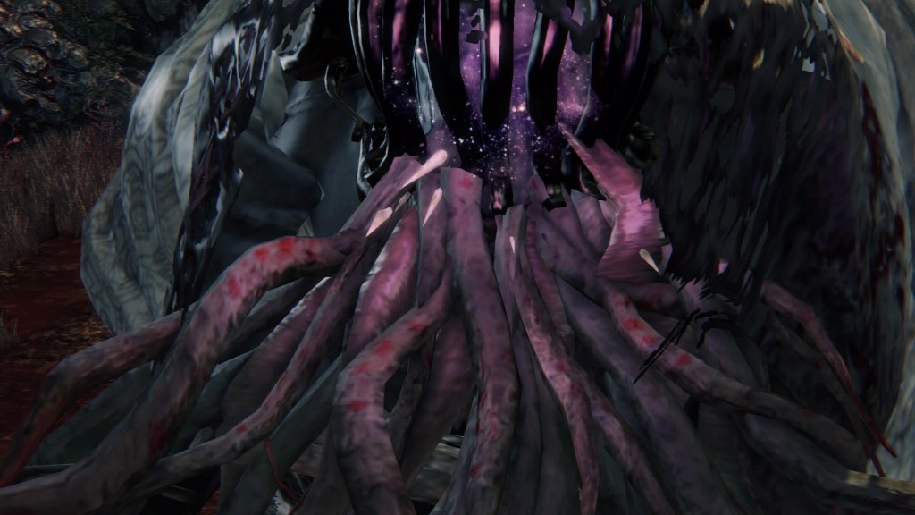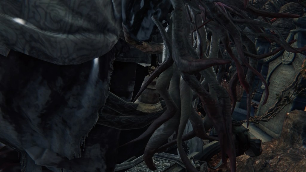 There were some saving graces to this disaster. Taking the place of the church giants in the Hunter’s Nightmare are the “bell-holders”, (鐘持ち) wearing said arcane collar over their white cleric uniform and wielding a similar silver axe. But unlike their Pthumerian counterparts, these giants can use their bells to conjure arcane powers and are equipped with metal armor at the extremities. The reason why is obvious seeing their helms give way to the mass of tentacles spurting from their nebulous head resembling an actual nebula, more spawning during grab attempts. The description to the Church Cannon indicates a loss of intelligence, but their massive arcane resistance reaffirms such minds have touched the cosmos. In that case, before successfully wrangling giant Pthumerians, the Grand Cathedral was sending out ordinary men physically enhanced via the secrets uncovered from their experiments; such giants with stunted brains may have even served as the proof of concept for their Pthumerian successors. Regardless, it was an excellent example to build upon.