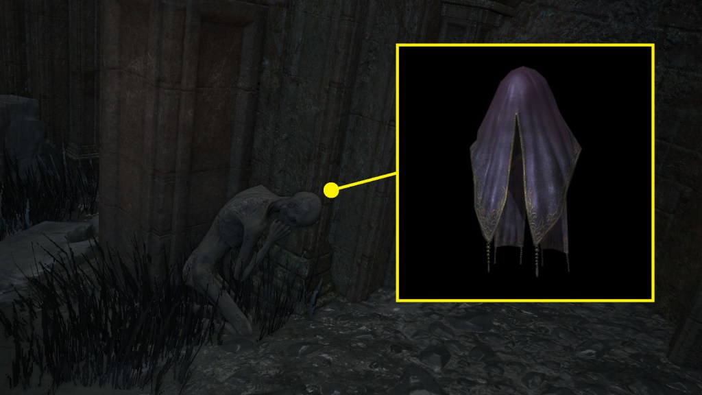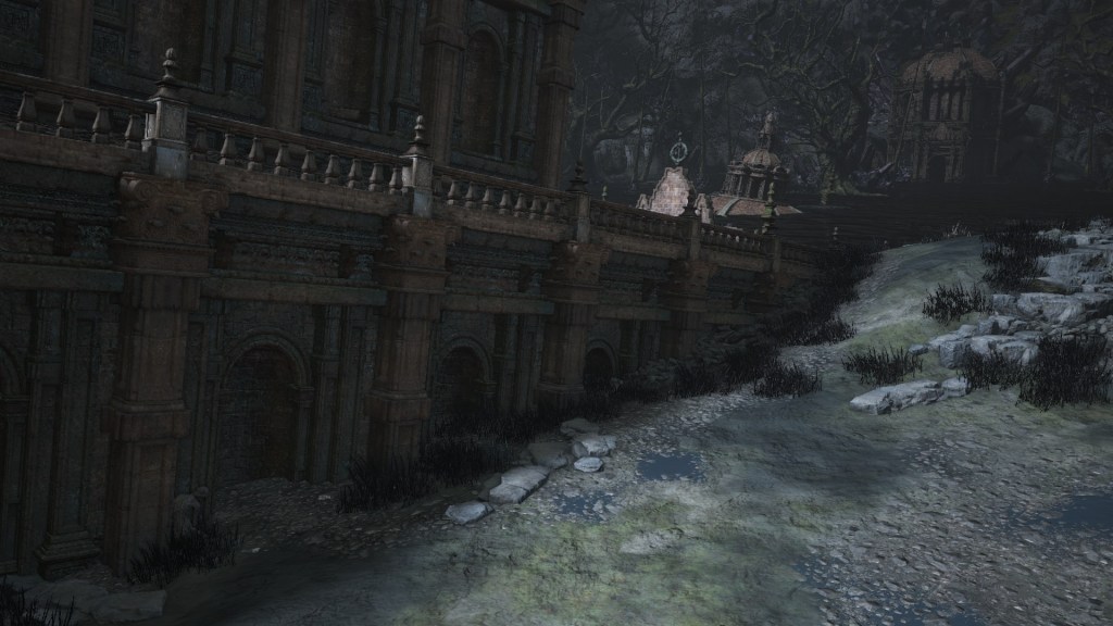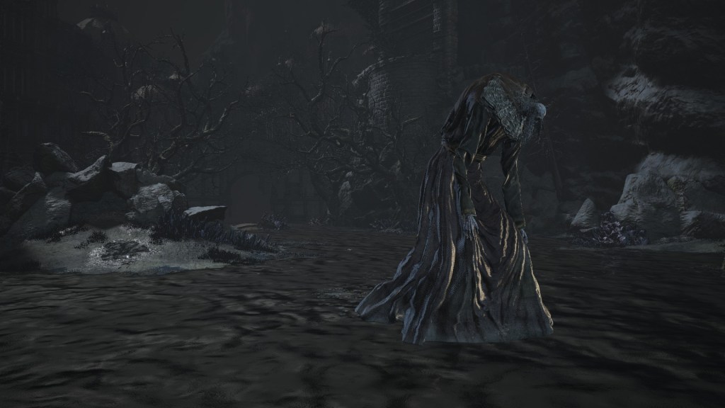 We can find the Black Witch Veil on a corpse at one of the buildings half-sunk into the Ringed City’s abyssal swamp. Aside from affirming implications that the heretic used it to hide her identity whilst intercepting Alva on his travels, the description does indicate that the clothing belongs to Zullie. However, DS2 demonstrated how Zullie’s garb wasn’t unique to her and had become the style of multiple magic casters. It is natural that a witch so infamous in the tales of minstrels would have copycats among her kind. Indeed, we can acquire the rest of her attire from areas neighboring the swamp; from a separate corpse, in one case. Moreover, giant adjudicators in the area can summon multiple spirits of women donning the black witch set with the pointed hat. If their identity was in any doubt, each conjures Dark Edge to perform an attack similar to the Black Serpent pyromancy using the basic sorcery staff. The giants trudging through the swamp and beyond have apparently forced various heretical witches into a pact, none necessarily Zullie. But why were they all there at this swamp? Simple. It reconstituted them.