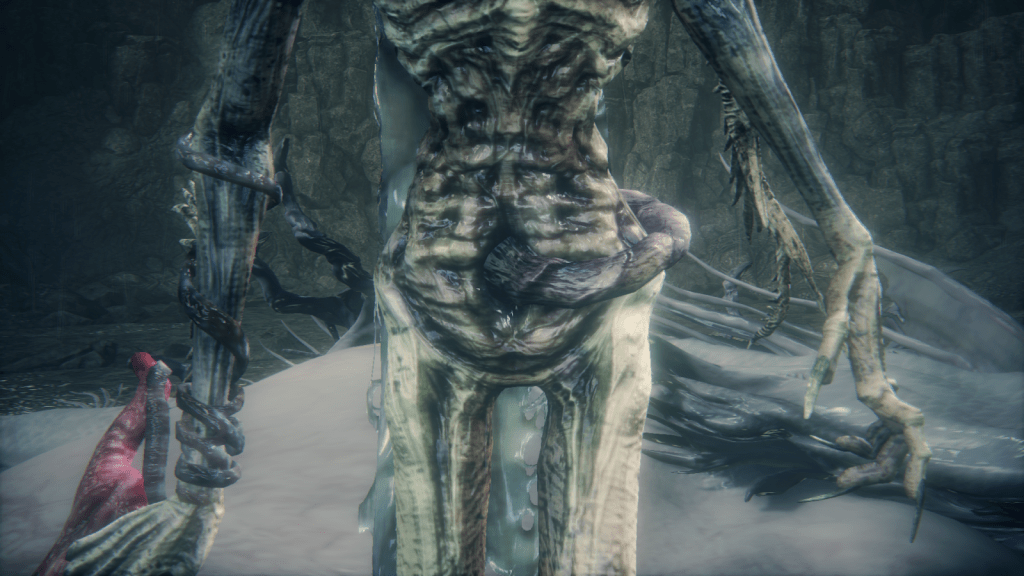 Before the shadowy heart of the Nightmare, we must slay the Orphan of Kos in the flesh. This “child” crawls out of the wrenched womb as if he had been left to die there with his mother. In reality, the boss serves more as a protective shell around the Nightmare’s core. When injured, the Orphan spews not just blood but also the same black fog comprising his shadowy doppelganger. Indeed, this Great One is no doubt a spawn of the curse. His weapon is his mother’s placenta, the “pommel” connected to an umbilical cord coiled around the boss’ arm until entering the elbow; it then exits again out the base of the spine and wraps around to the belly button. Since the organ is responsible for supplying blood to the fetus, it is no surprise to see the copious amounts contained within bubble up the pinkish membrane like a pus. This blood cut off from its child is what has stewed in resentment, the cursed will now flowing into the Orphan. That is why the pussy material explodes with the black fog when thrown by the boss, and why he is empowered after gobbling down on the stuff directly. The curse sustains him.