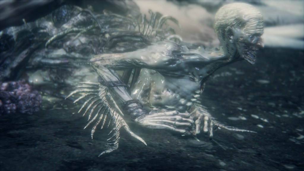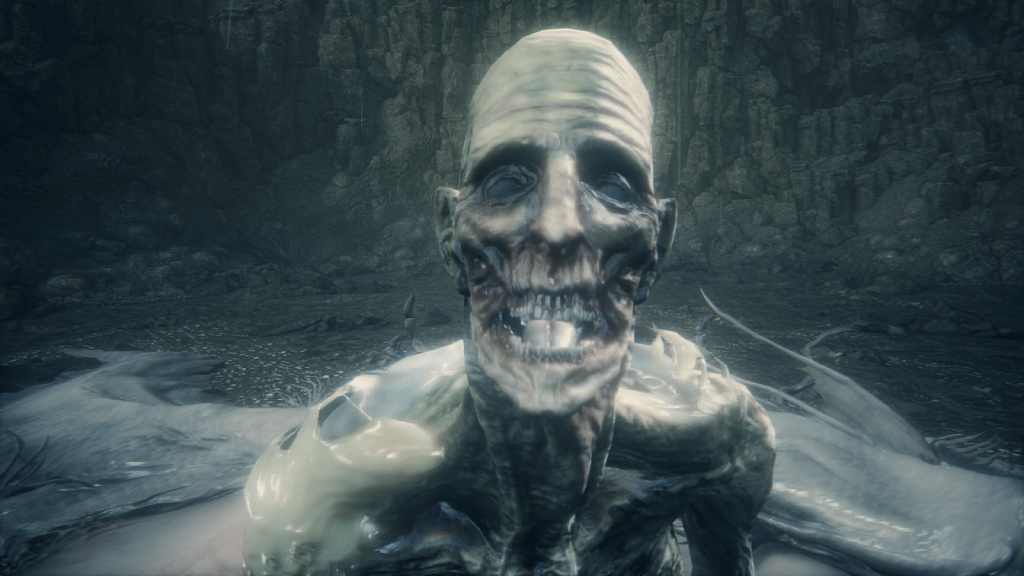 Of course, this punishment is inflicted upon Kos’ child in equal measure. The priest in the graveyard prays that Kos’ love will eventually reach the elderly babe, demonstrated by the stench of her freshly rotting corpse embracing him; fish do begin to smell more quickly after death, and we see ghastly green gas emanate from that viscera the Orphan first tears himself free from. Add in the cut dialogue where the priest mistakes the Yharnam Stone taken from the Pthumerian Queen’s corpse for his god’s child. This alone is news worthy of blessing the messenger, outsider or no. Clearly, the priest is aware of the man child currently nestled in her dead womb, believing the baby received “salvation” from death like them. But ideally, he wishes the wizened Orphan fully returned to his mother, so that they may at least die together when reality had them so cruelly separated. It is that fact, more than anything else, which drives the grudge. Anything less is simply extending the suffering to the innocent newborn. And as Kos’ reaction even from beyond the grave shows, she is incredibly sensitive to her baby’s pain.