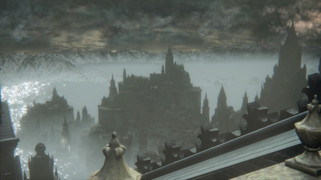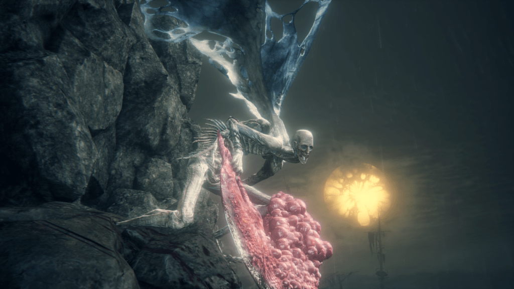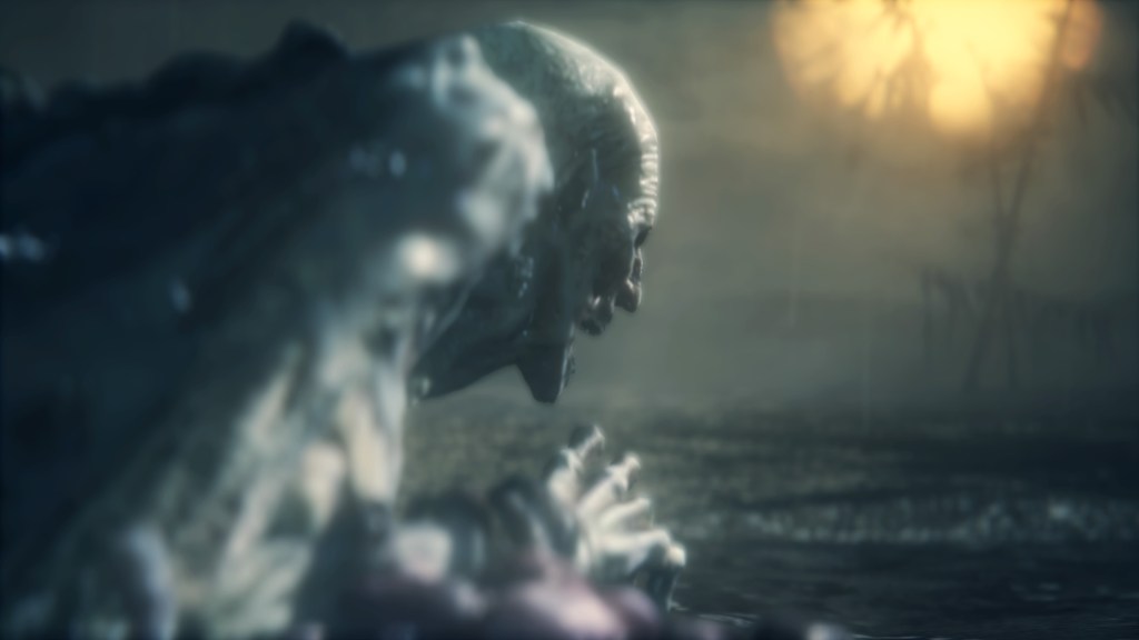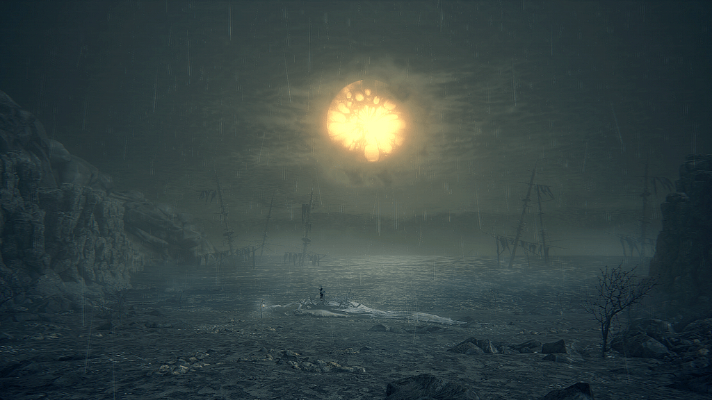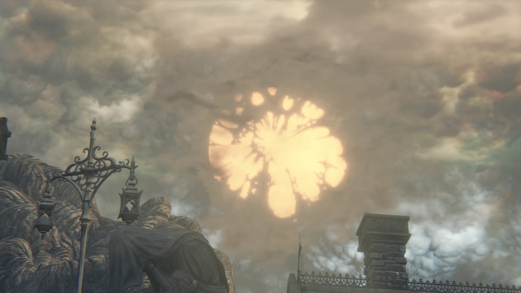 The seed to this proverbial seedbed, naturally, rests at her corpse on the beach, specifically her womb. From there, the black fog possessing the blood-drunk hunters rises in the vague form of the Great One’s missing child, the Orphan of Kos. How fitting that “orphan” (遺子) is pronounced ishi like the wills left in dying blood, for “killing” this shadowy phantom brings the curse to an end, along with the hamlet’s constant rainfall and the Nightmare’s aberrant sun. We can thereby be sure that the rain is an expression of the vengeful Great One’s grief, a lament which the villagers can sense in their aching scales — the same way a fisherman might sense a storm in his aching bones. Likewise, we can be certain that the sun is an expression of the weeping god’s wrath, her grudge incarnate hanging like an ever-watchful eye. In essence, breaking the curse grants final closure to this evil spirit, putting her as much to rest as the hunters trapped in her nightmare. Until then, both parties will remain in this endless cycle, never to escape the Great One’s sorrow and rage.