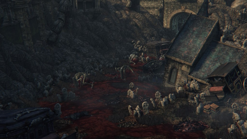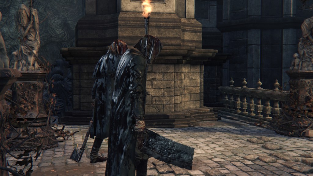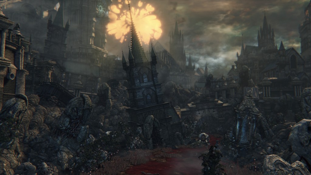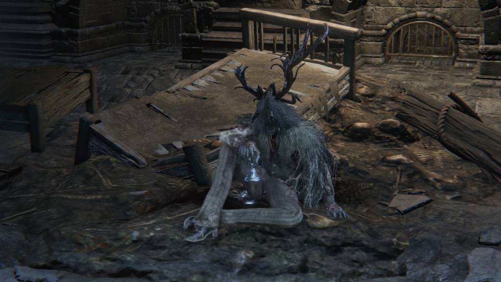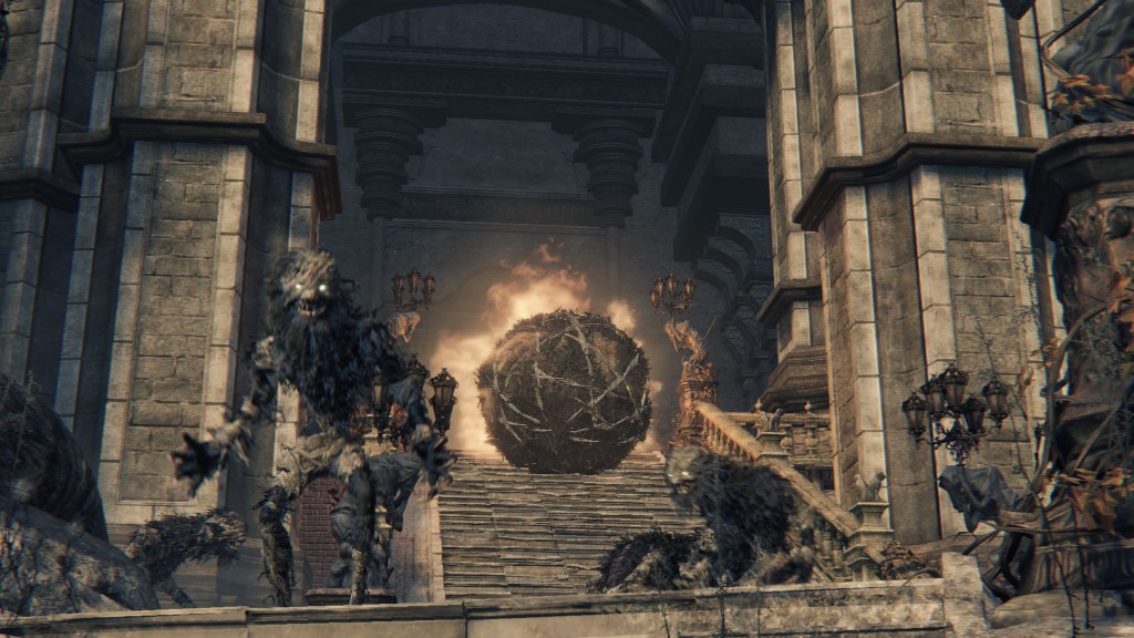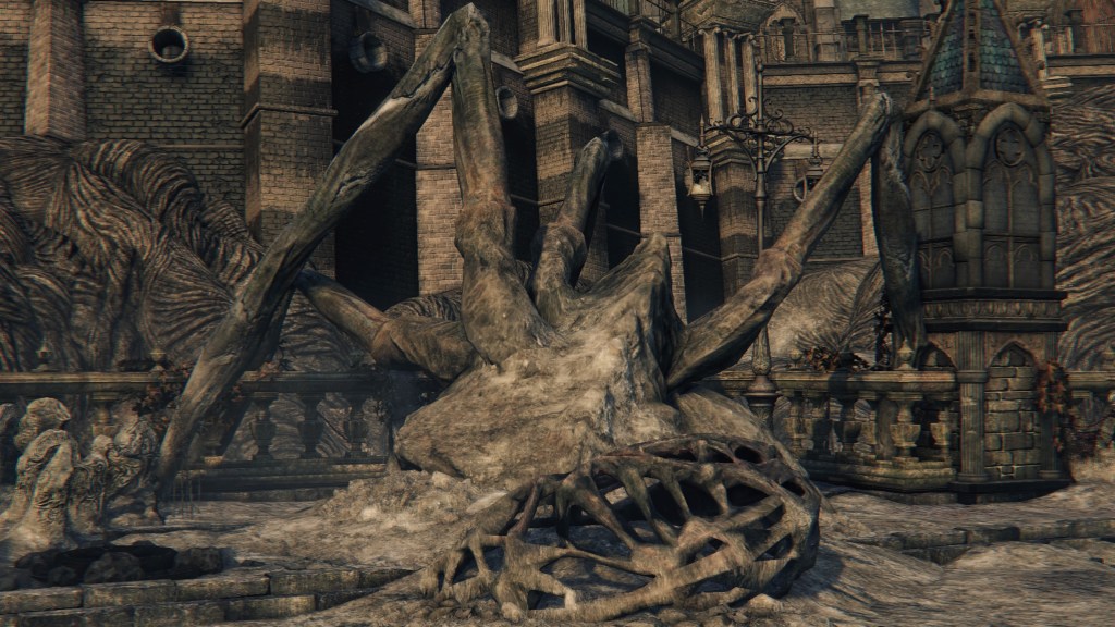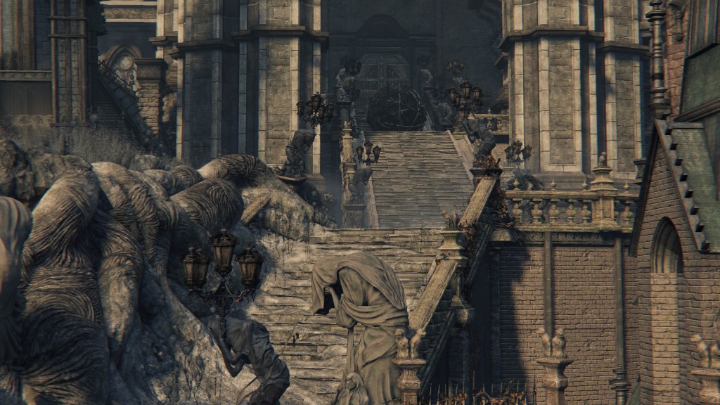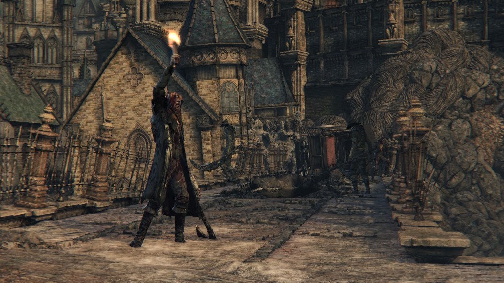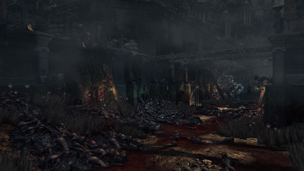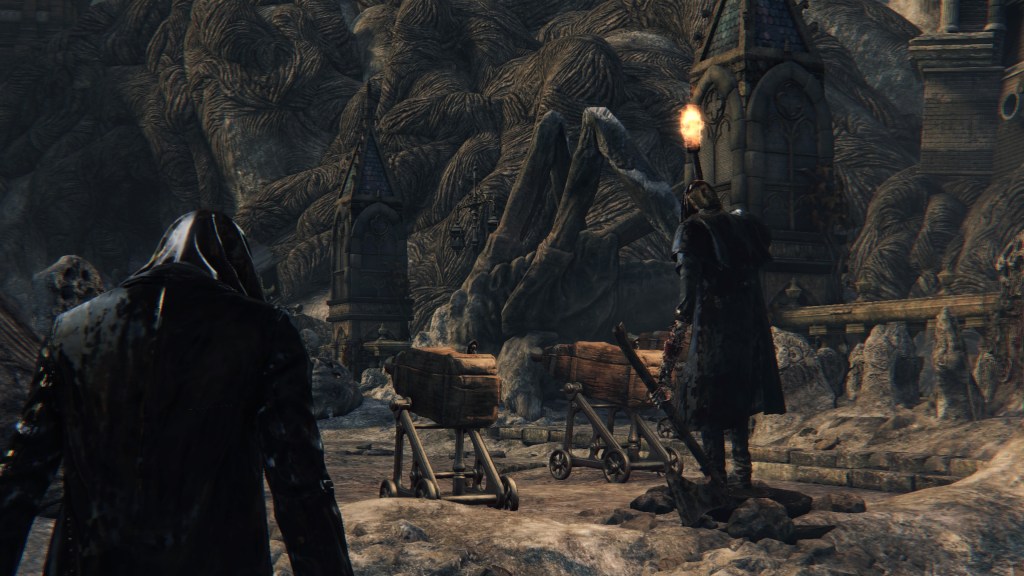 A nightmare was created as a direct byproduct of the hunters’ misdeeds upon the Fishing Hamlet, according to Simon. This Hunter’s Nightmare traps them in a surreal mash-up of Yharnam’s various parts, at times duplicating or otherwise warping these spaces. Naturally, the old hunters from Gehrman’s heyday are frequent in this dream, reenacting events from long ago. We see beast patients throughout Cathedral Ward hide or flee in terror as the hunters give chase. Sometimes they have aid of their faithful dogs, other times they use more creative means. One particularly mischievous pair rolls a blazing ball of kindling down the Grand Cathedral steps to kill a passing pack. Another sets up a web of trap gun emplacements on the Great Bridge. Yet more lie in ambush around street corners or inside the buildings; in one especially nasty example, the blood minister of the bridge’s clinic sits dead, wheelchair set to explode with a room full of oil urns upon attempting to loot the adjacent hunter’s corpse — carrying the Boom Hammer, of course. Anything they did or might have done in the past is repeated.