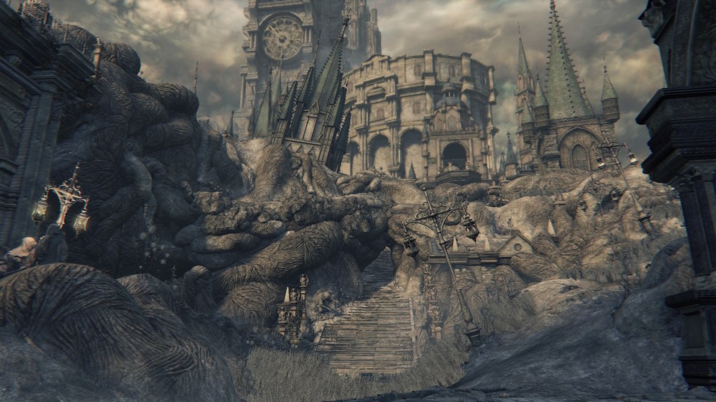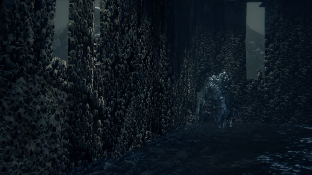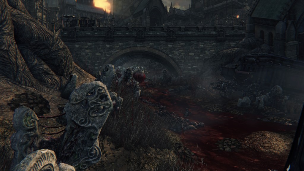 By the time we arrive, countless have already fallen to their prey or fellow hunters, the bleeding bodies forming a river between the Nightmare’s two Grand Cathedrals. This river of blood acts as their graveyard, the entire stream of corpses lined with tombstones otherwise only seen in the Nightmare Frontier. Despite the bodies piling all along the river, the blood still flows in more or less the same direction. The river ends in a dark cave, where many corpses carry bloodstone chunks demonstrative of the sheer volumes pooling there; a cleric-turned-blood-starved beast also lurks at the very back, no doubt lapping it all up. Heading upriver, we come across swarms of blood-lickers, numerous drunk hunters obviously devolving into these beasts as they obsessively fatten themselves on ever more. And as we continue following the river flow, we begin seeing pillars of stone faces arise as if bubbling from the blood, most likely a manifestation of the resentful wills inherent; those sentiments would naturally be fresher closer to the source.