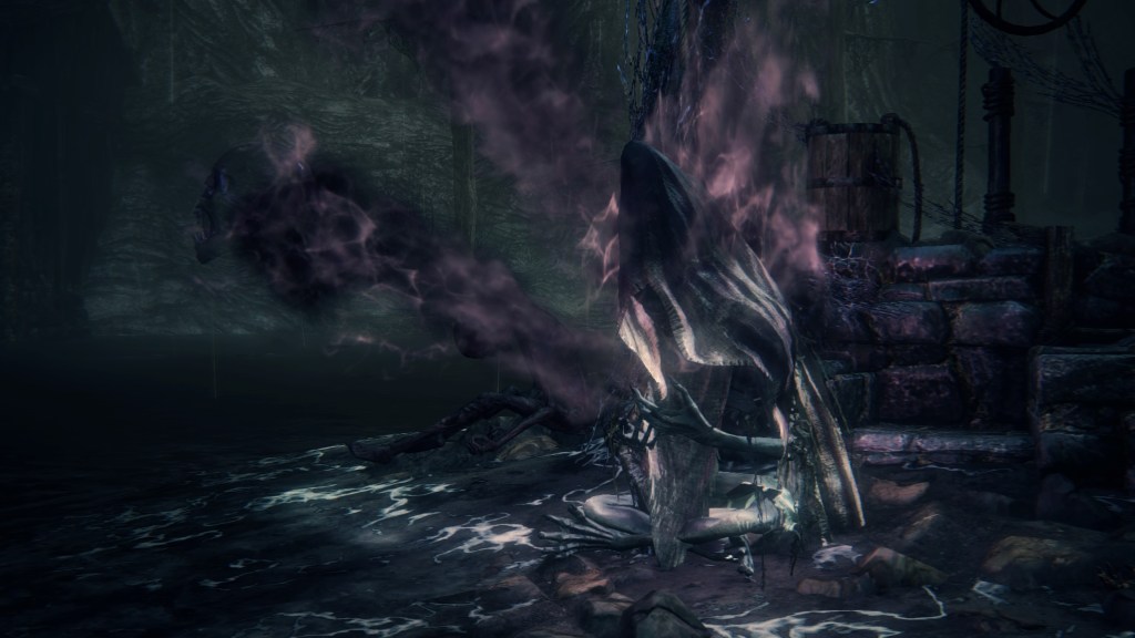 The chants ask the phantasms to “weep” with their dead selves in cursing the hunters, citing how those who need the malediction are as bottomless as the sea. After seeing our apparent will to help with this cursing, the first priest hands us the Accursed Brew, allowing us to draw out the vengeful spirit within with quicksilver and direct his cursed will at others. Other priests around the hamlet all already do the same, summoning the wrathful spirits in the area to home in at our approach. The hamlet is not just giving the dead their final rites. They are drawing upon their own grudges from their dying moments and beckoning phantasms — all ultimately fragments of the wrathful Kos — to amplify their curse upon Byrgenwerth and its legacy. The Fishing Hamlet wishes nothing more than to see all be cursed as blood-raving beasts in that “sea” below, and so work tirelessly to add more arcane fuel to the resentful fire.