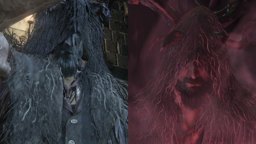 So far, this has mostly meant that the hunters enter a karmic cycle of hunting and being hunted, drunk on blood. However, we see that the Nightmare can be tailored to the captive’s own personal hell. For example, Laurence takes the form of a generic cleric beast, representing his place as the first to define the concept. However, this beast burns unendingly, reflecting the man’s obsession to “purify” the disease of its unwanted bestial element with painful results. Never will Laurence know peace, his flesh constantly yet not ever truly consumed by fire, his insides turned molten. His body has become so fragile, that his bottom half simply collapses upon the weight of the top midway through the boss battle. The only thing keeping this dysfunctional corpus alive is Kos, but even that is not enough to satiate her grudge.