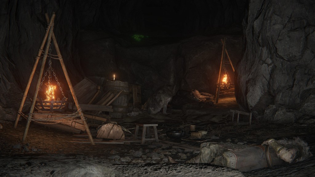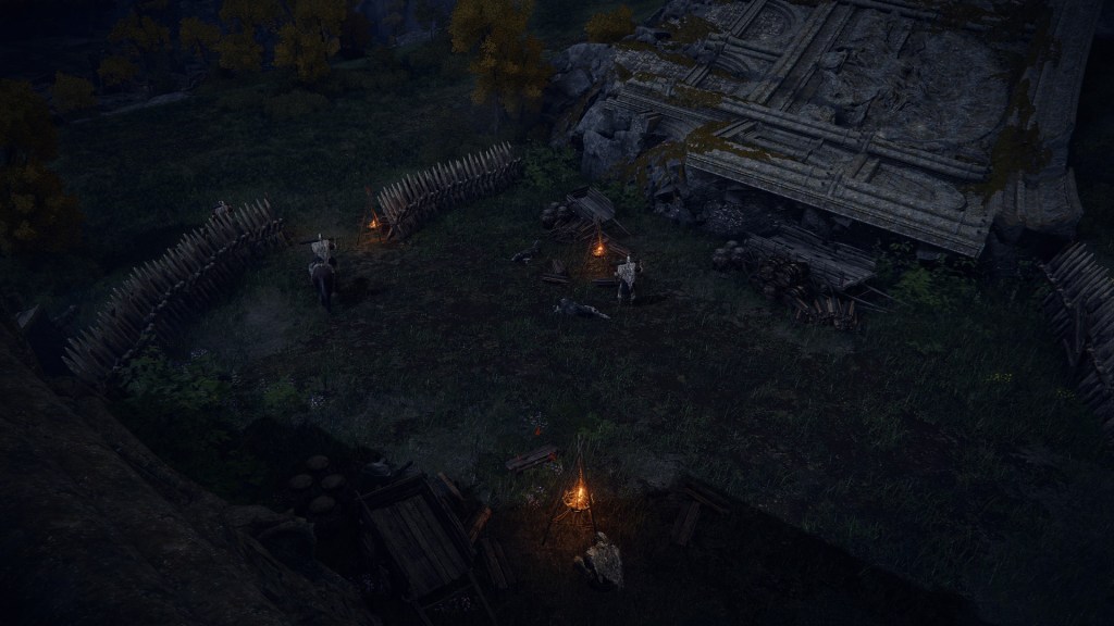 With the Shattering all but at a formal stalemate, the sellswords still in Limgrave have understandably gotten antsy as their new master occupies himself with grafting. Many seem to have simply deserted. One camps out all by his lonesome on the western shore beneath Stormhill. Another stationed at the Weeping Peninsula chooses to live out in the woods with nothing but wolves for company. An entire camp of mercs with their pet wolves has set up east of the Gatefront Ruins, uniquely opting neither to raise Godrick’s banner or pitch tents with the Golden lineage’s crest. Another collection of Kaiden warriors took shelter in the High Road’s Cave, only to be killed as they explored deeper into the ruin-strewn cavern by the pack of wolves and consortium of octopuses calling it home. Two more possible deserters can be found having just pillaged a noble’s cart heading for Stormveil. Based on these numbers, over half of Godrick’s sellswords have abandoned him along with any hope of returning to their wintry mountaintop. What few remain in the Grafted’s employ keep holding onto their shared dream of home.
