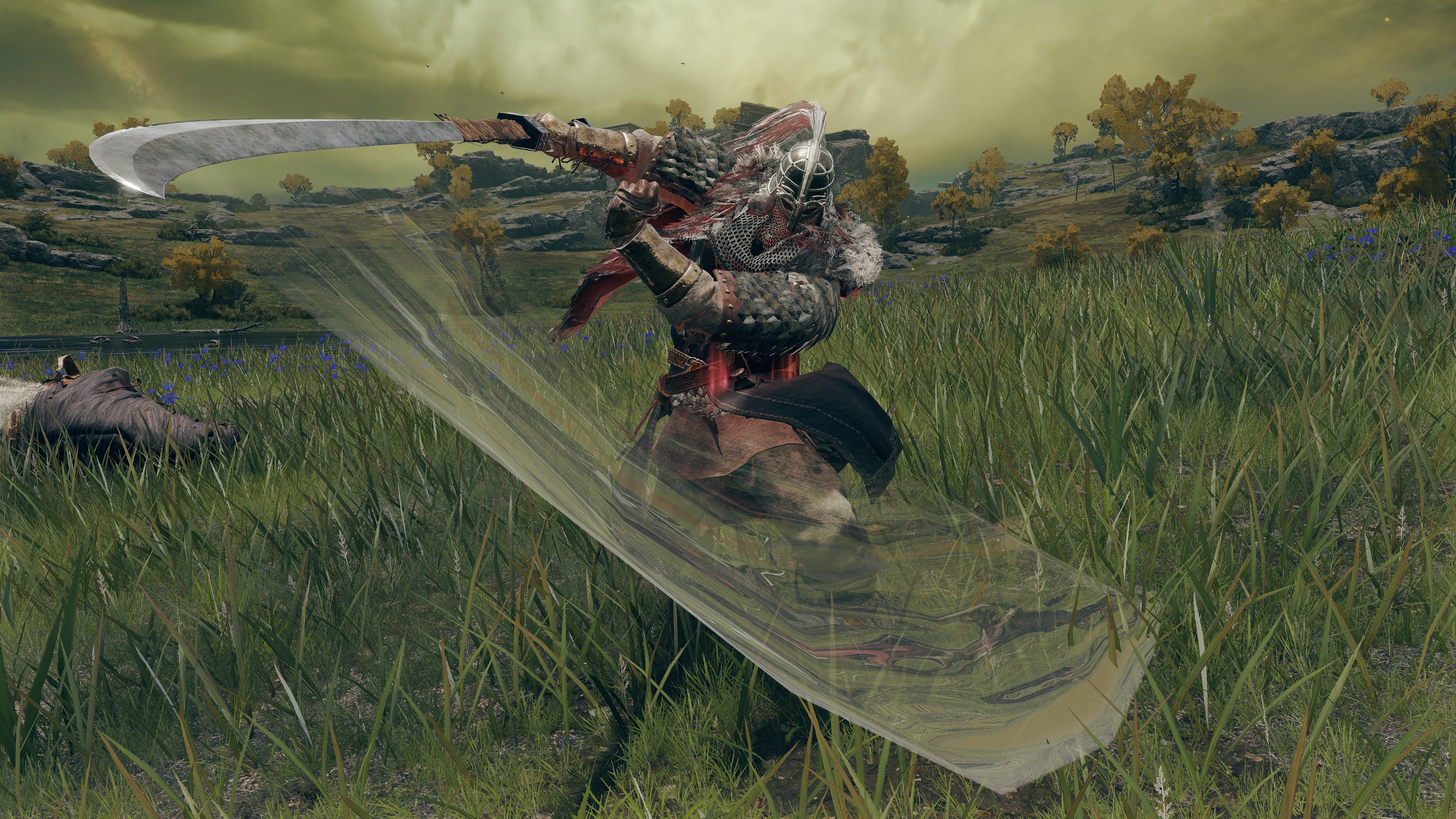 Possessing the superior strength and dexterity to wield the weapons with which he would instruct others, the Night Cavalry’s teacher drilled them until they all surpassed the limits of their beloved Dismounter. Those favoring strength adopted the powerful but weighty glaive, while those favoring dexterity adopted the lacerating but unwieldy flail. Eventually, they too earned the right to wear their teacher’s armor and ride the funeral horses like grim reapers. This may have been a protracted process depending on when exactly the first member was conferred. They must already exist as a full company by the time of the Second Defense of Leyndell, given that it is the only known conflict in which the “Fell Omen” was present to lead any soldiers in reaping heroes. At the very least, training was probably already underway by the time of the First Defense of Leyndell.