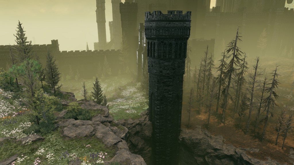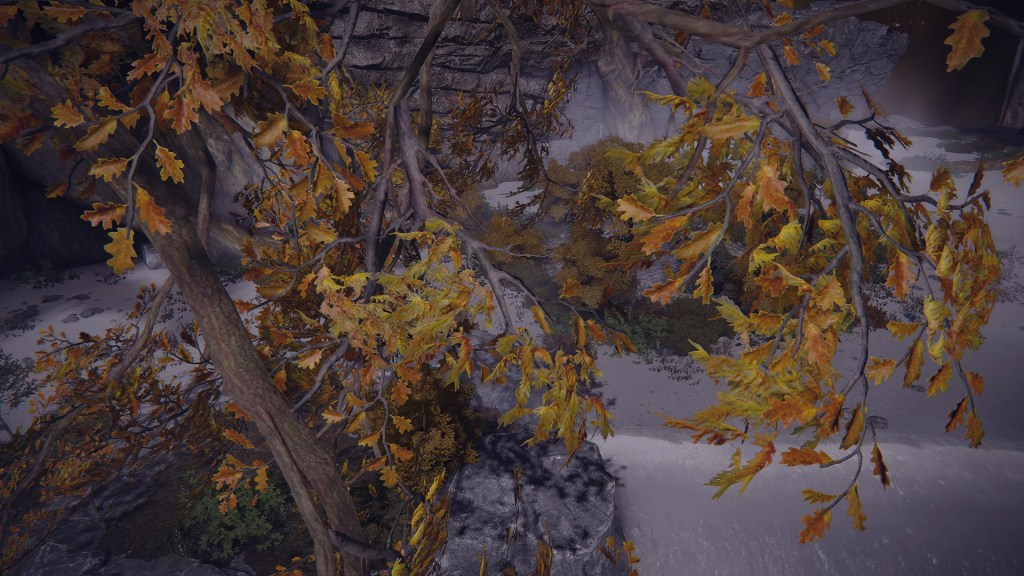 We see that most of the trees, bushes, and grass in the Realm of Shadow have some shade of brown foliage, including the large conifers. While certain conifers in the Lands Between might appear more brown than green, these tend to be obvious outliers subject to dying, a natural phenomenon in any large grouping of trees. Plants in the lands hidden in shadow, however, generally appear to be flourishing. The only areas not characterized by the color brown either reserve a competing power, such as the Frenzied Flame in the Abyssal Woods, or enjoy another countervailing quality — for instance, the clear delineation between the rest of Scaduview and its hinterland thanks to the Shadow Keep’s rampart indicates an outside effort to preserve it as is. Then there is the Deathbird territory down south, Charo’s Hidden Grave and the Cerulean Coast located furthest from the Scadutree. Put another way, proximity to the tree may be the most fundamental factor at play. Add black to yellow and it can become brown. Instead of yellowing, the Scadutree might cause browning to the flora around it.