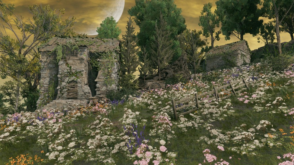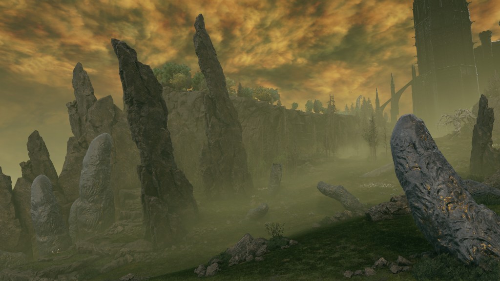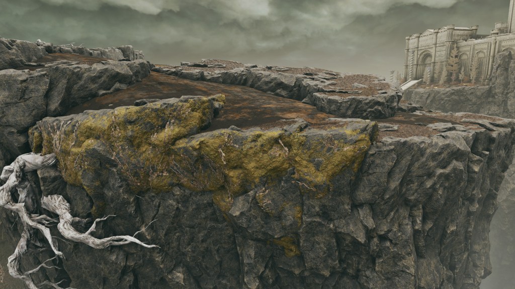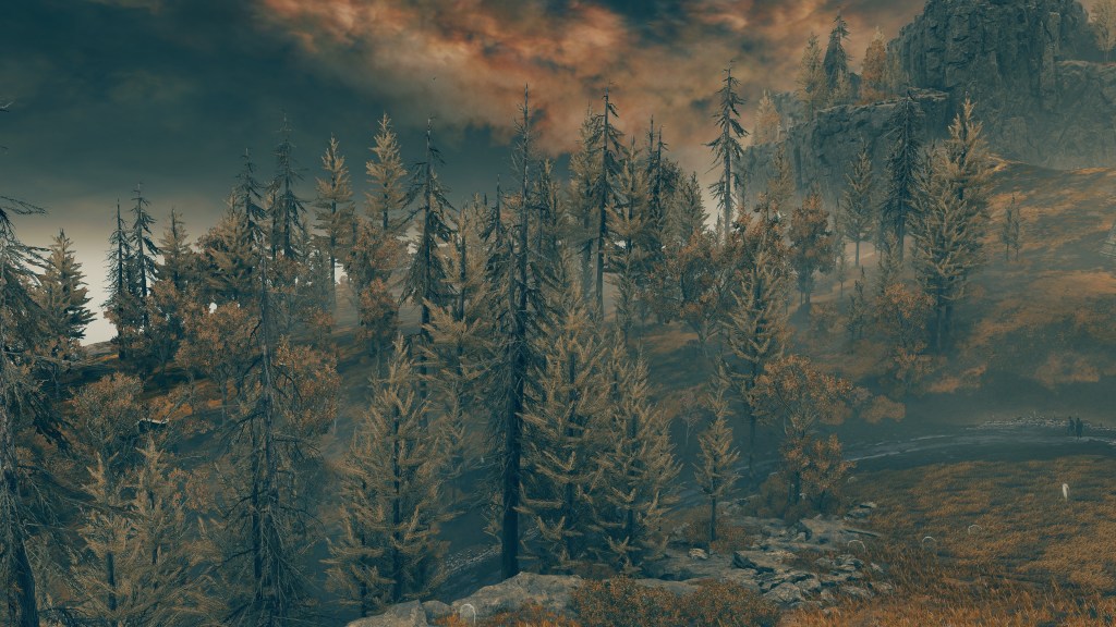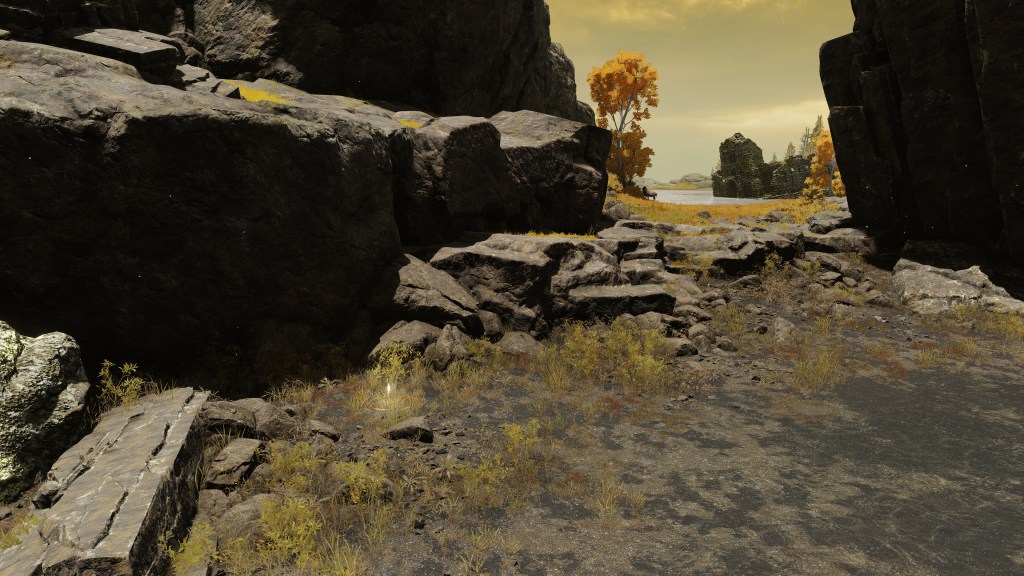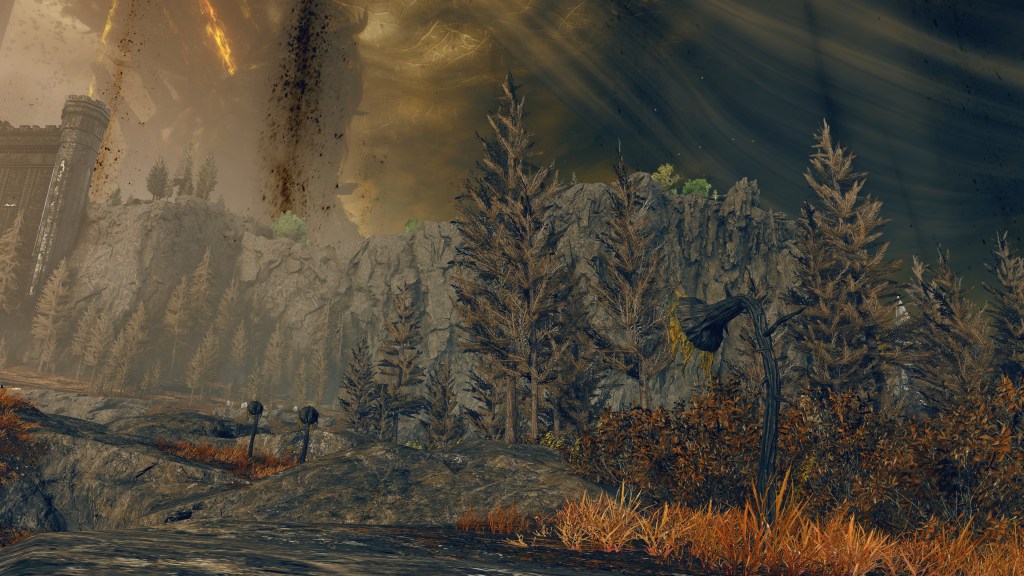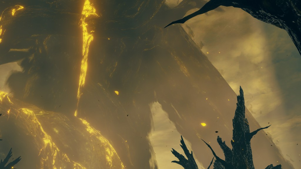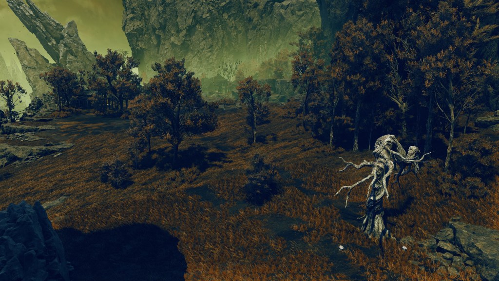 Putting aside the foliage, we do see proximity to the tree affect the land. Upon reaching northern end to the Gravesite Plains and Scadu Altus, rock faces become visibly infused with gold. The ruined forge in the northern plains likewise hides gold smithing stone, with the forge on the plateau containing even more. Scadu Altus is also unique for the golden color of its tallest grass, though this curiously doesn’t extend to Scaduview behind the Shadow Keep. Even still, golden fireflies lurk in a pond with that backyard view. There are also golden skeletons rising from the graveyard in front of the Keep, mirroring those buried outside Leyndell. Overall, the environment seems to absorb more gold the closer one is to the Scadutree. Driving home the notion is the Land of Shadow incantation — subsequent to weaving its thorns of rejection through the earth, the Scadutree Avatar begins launching “pebbles” of gold and shadow as if it were glintstone. It is undeniable that the Scadutree mimics the Erdtree in these other respects, so why not with coloring the plants? Once exposed to shadow, the center of the Lands Between gradually transformed.