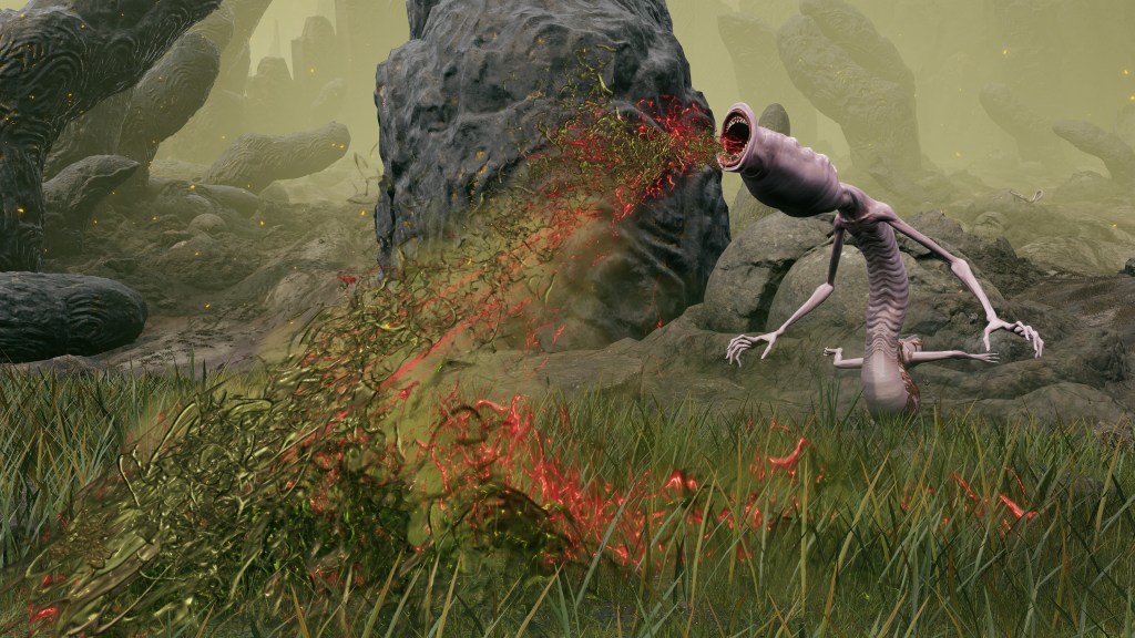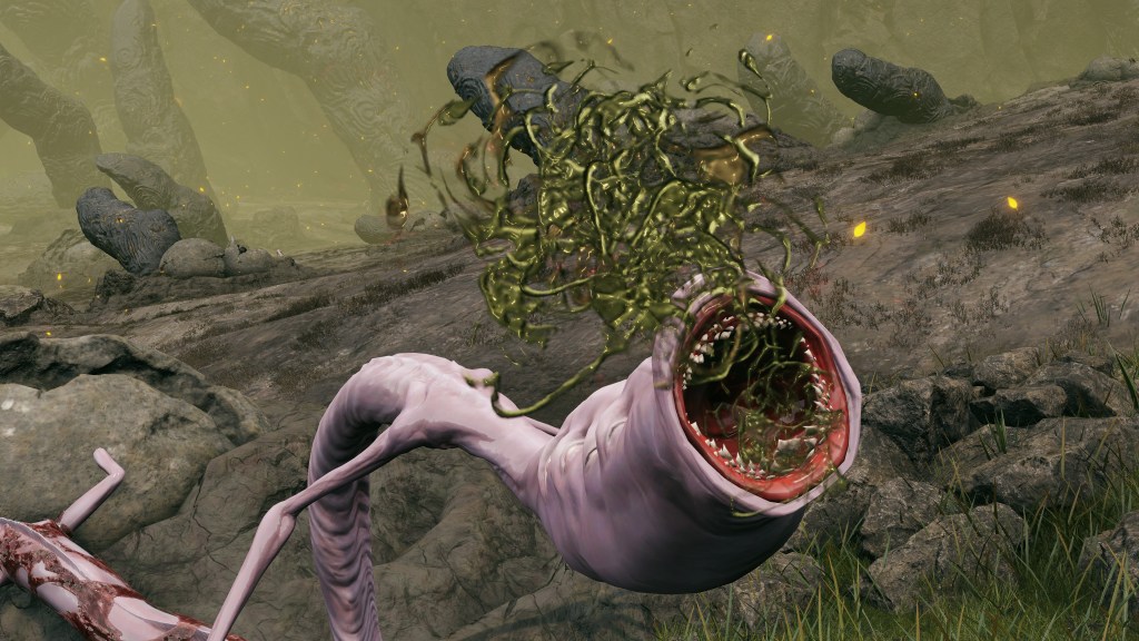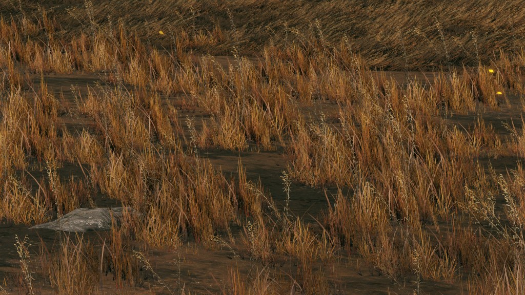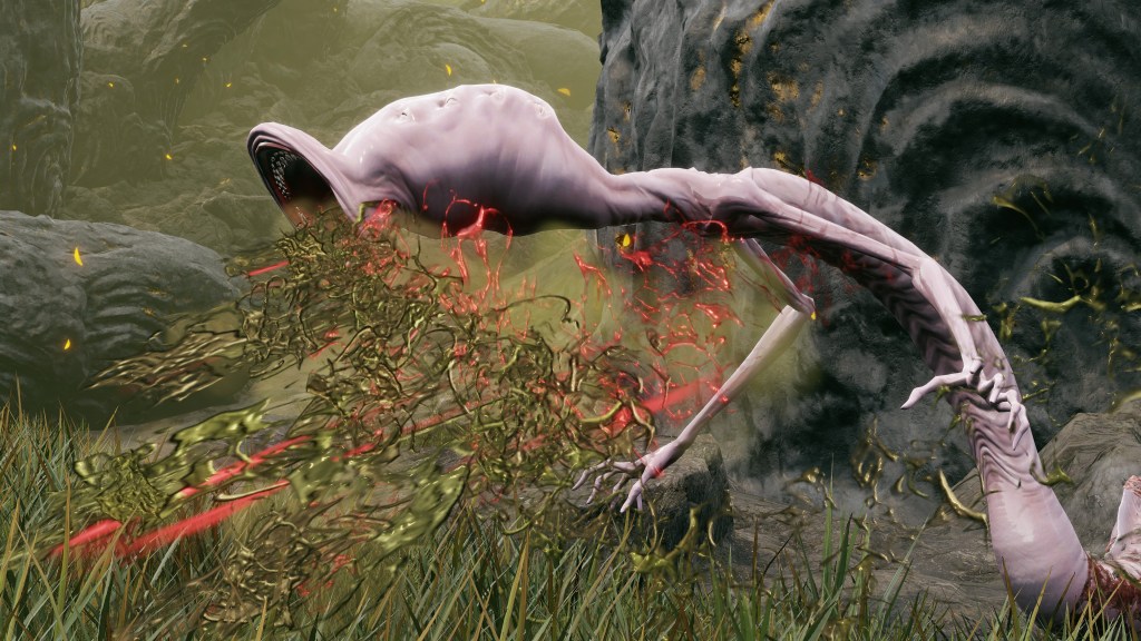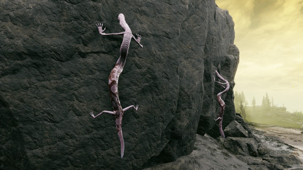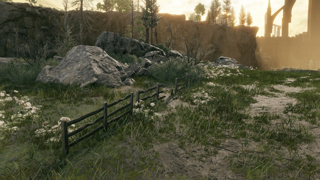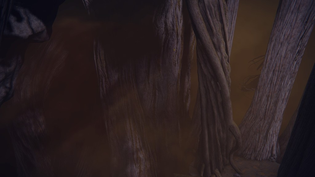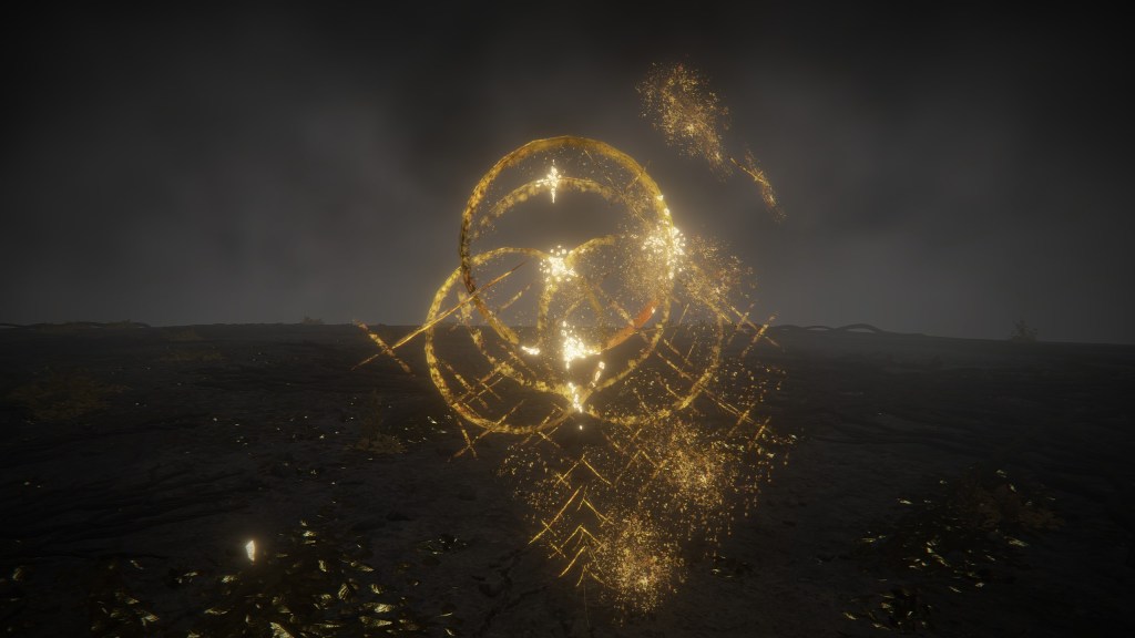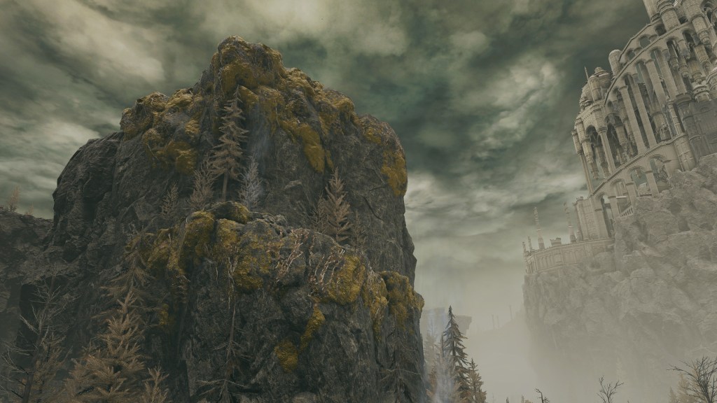 Putting aside the foliage, we do see proximity to the tree affect the land. Upon reaching northern end to the Gravesite Plains and Scadu Altus, rock faces become visibly infused with gold. The ruined forge in the northern plains likewise hides gold smithing stone, with the forge on the plateau containing even more. Scadu Altus is also unique for the golden color of its tallest grass, though this curiously doesn’t extend to Scaduview behind the Shadow Keep. Even still, golden fireflies lurk in a pond with that backyard view. There are also golden skeletons rising from the graveyard in front of the Keep, mirroring those buried outside Leyndell. Overall, the environment seems to absorb more gold the closer one is to the Scadutree. Driving home the notion is the Land of Shadow incantation — subsequent to weaving its thorns of rejection through the earth, the Scadutree Avatar begins launching “pebbles” of gold and shadow as if it were glintstone. It is undeniable that the Scadutree mimics the Erdtree in these other respects, so why not with coloring the plants? Once exposed to shadow, the center of the Lands Between gradually transformed.