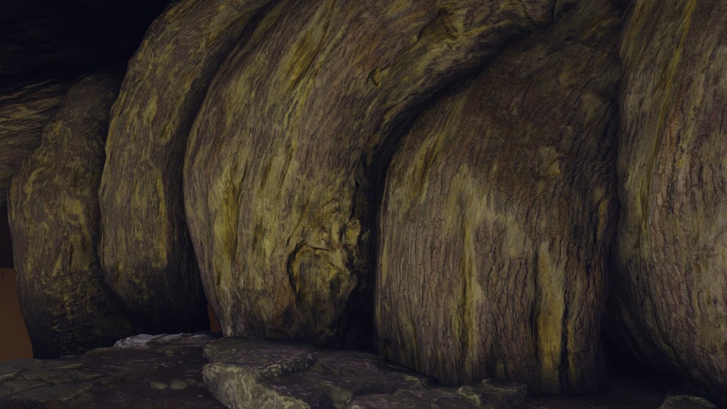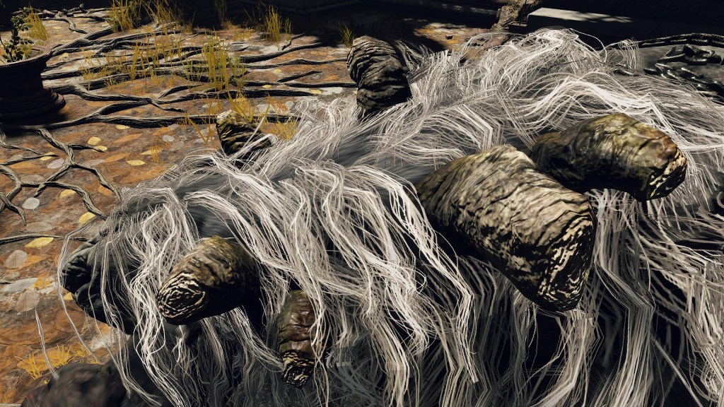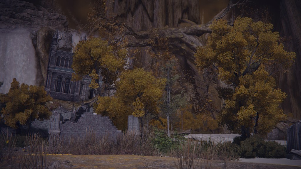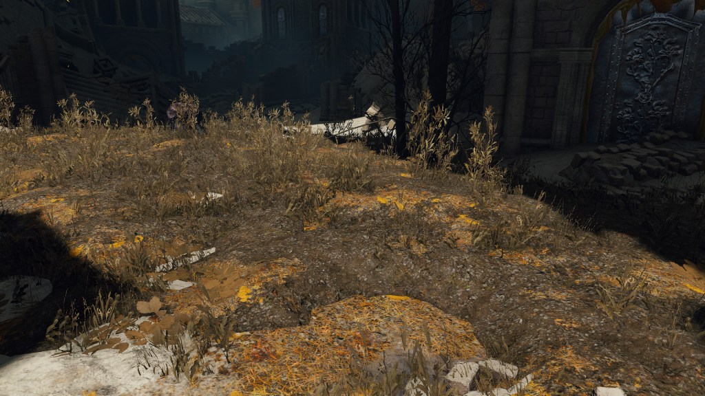 The greatroots break above ground wherever there are large concentration of trees; if our map depicts a forest and the soil isn’t flooded, sure enough, they will be there. This indicates that the Erdtree is attracted to other trees, trying to integrate itself into the tangled network of roots which longstanding forests form. If so, then the Elden Ring was already spreading its influence through the roots before its trunk was tall enough to shine across every corner of the continent. That would explain why we see the yellowing affect trees hidden from the Erdtree’s rays, including underground — flora needs to be isolated from the body as much as the light. This might explain why grass growing on the upturned dirt in the ruins of Leyndell’s Lower Quarter is mostly green. Even underneath the Erdtree, it has insulation above the rubble and beneath the cover of Gransax’s body for most of the day. More exposed spots grow like on the rest of Altus. Root or ray, so long as gold effuses through one medium, it doesn’t matter.
