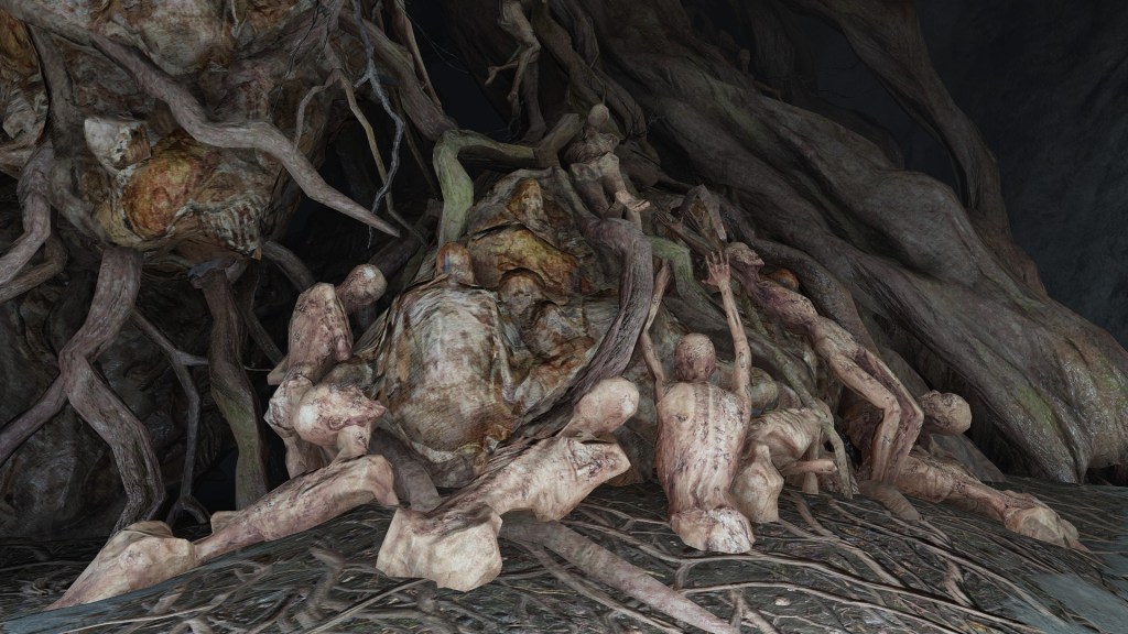 One characteristic practice of Marika religion is Erdtree Burial. Framed as “returning” to the golden tree, bodies are laid to rest close to the roots. When the roots are too deep for a ground burial on the surface, catacombs are dug so as to expose them directly. The effect these roots have on the dead is most obvious in these underground graveyards. The main burial chamber is covered in roots appearing to drag in the skeletal bodies lying all over the floor. At the back are the core roots where more fleshy bodies look to be assimilated. This is the intention, as shown by the statue atop hero graves — the hooded figure offering a corpse that longs for something out of reach to the towering trunk. From this, anyone might be taken, body and soul, and incorporated into the Erdtree. Just as the radiant tree has permeated life with runes, so too has it developed a means to recover that lost power, returned via the earth. The practice of “tree-returning” (還樹) helps optimize the recycling process, but it is ultimately the great roots’ behavior.
