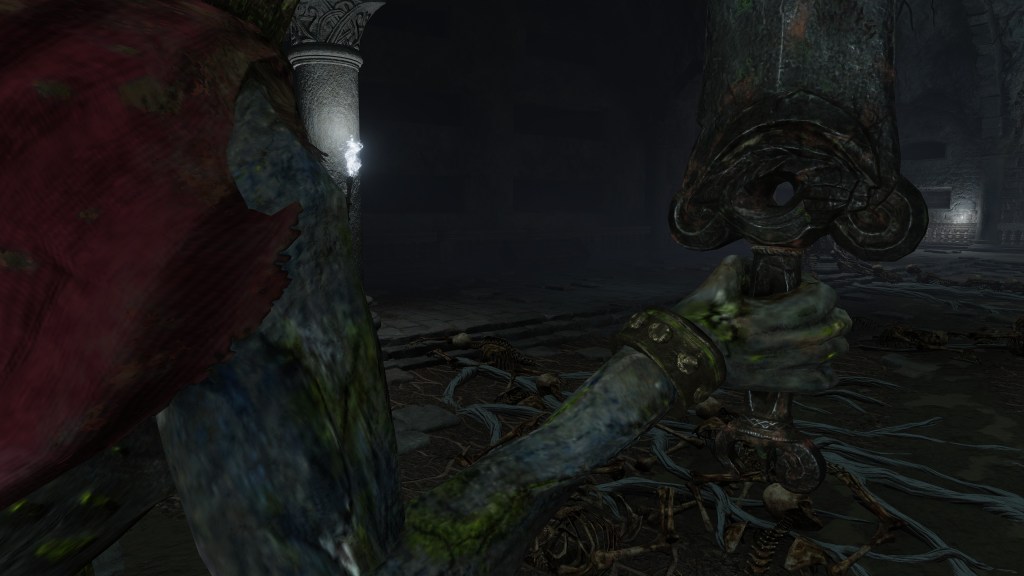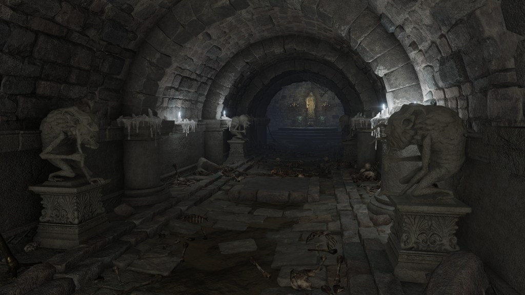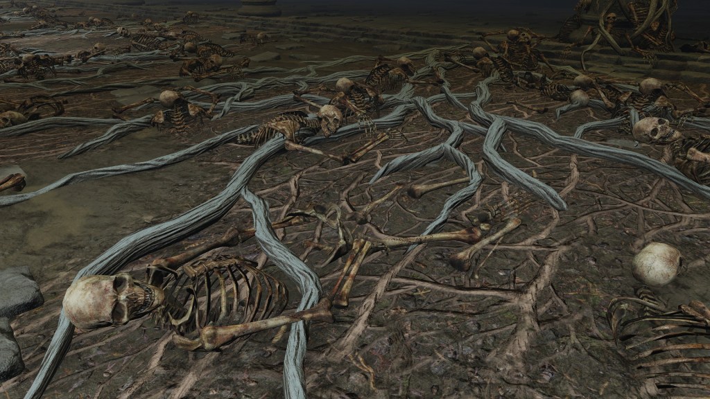In this way, Erdtree Burial facilitates a key role rounding out the people’s egocentric narratives. Gold has afforded them the opportunity to shape their own lives to a greater degree than ever before, which also puts a heavier onus on them instead of fate. And while maybe not on their terms, at least those who fail to make something of themselves can still take solace in helping posterity with their burial. Admittedly, the process is slow-going, with so many buried in anticipation of returning to the tree rather than actually doing so. Cemeteries and crypts have no shortage of bones laying in and out of their graves, obviously left to rot without being absorbed. This seems to be due to the Erdtree’s limitations. The spirit sitting in the Stormfoot Catacombs mentions needing to wait for the greatroots to “call”, implying that the tree is prioritizing bodies based on its own criteria. This only matters if it cannot assimilate them fast enough. Catacombs therefore include auxiliary chambers because the roots take their time with the deceased before the rest may be granted audience. Still, waiting in line is preferable to dishonor.