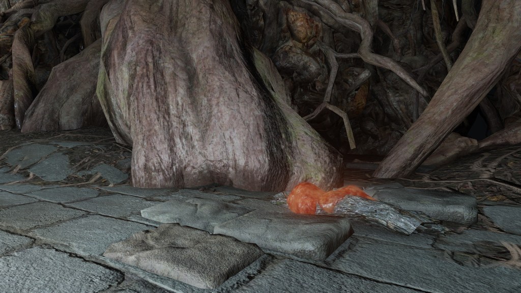 Just like its depiction in Farum Azula, the Elden Ring spread its roots far and wide through the Erdtree. Although these have mainly been attracted to forests, they stretch seemingly everywhere in-between at some depth. We see this not only within the various catacombs burrowed deep beneath the land, but also the numerous graveyards on the surface, many of which give rise to Those Who Live in Death — skeletons reanimated by Deathroot stemming from the great roots. Beyond the natural resin used to craft various greases for weapon enhancement, these especially large roots bring with them no particular benefit for their surroundings. Neither do they demonstrate any degree of golden power; whatever faint holiness is channeled from the tree appears to immediately dissipate into the earth for nearby plants’ root systems to absorb, which is miniscule looking at the yellowing phenomenon outside Altus. However, the primary function of roots is to nourish the tree, collecting resources for the plant to grow and thrive. And as is so often the case, this nourishment derives from entropy.