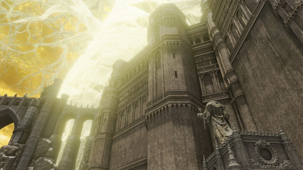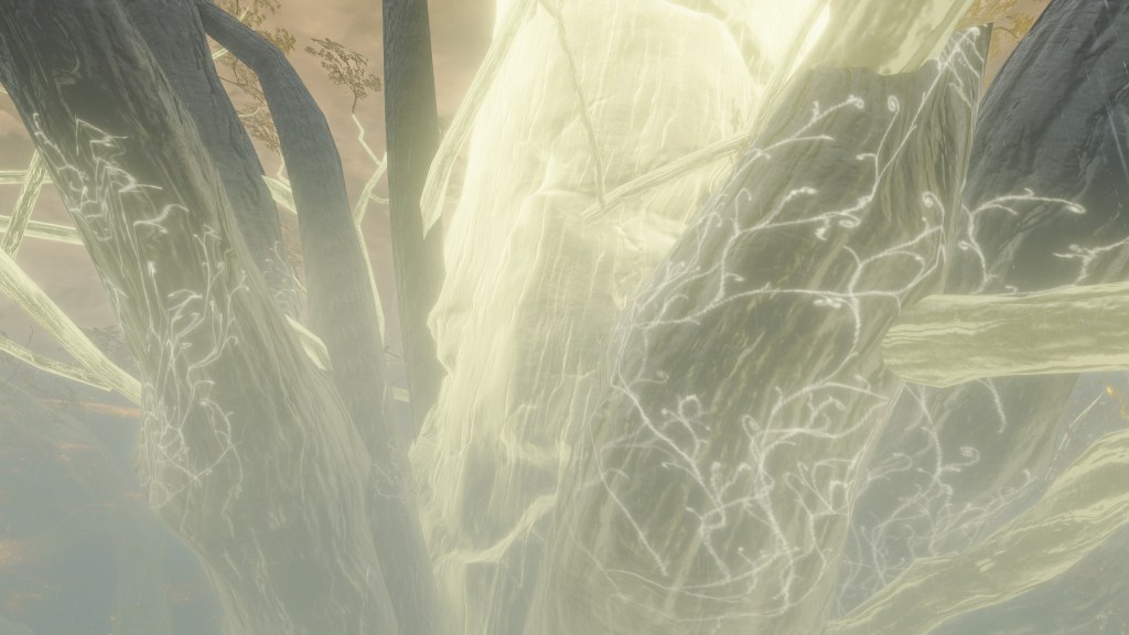 Thanks to the Elden Ring, the Erdtree projects the power of gold, its bark glowing with the color. This is true for only above ground, and not even in its entirety. Close inspection of the treetop reveals that the golden glow peters off into to a twisting vine pattern, leaving ends of the highest branches their natural color. This betrays the phenomenon as deliberate on the tree’s part, ensuring that the most visible portions do provide a consistent shine. Combined with its size, and golden rays fall upon even the farthest reaches of the Lands Between. This phantomic radiance was even brighter before the Elden Ring broke according to the Erdtree Seal’s description, and we might still witness a remnant of this. Many lamps in Leyndell use leaves shining white like glowstones, a stark contrast to the faintly glowing yellow leaves which occasionally fall from the sky on a strong breeze. Even assuming that the lamp foliage has been tampered with, they may well capture the full radiance on display during the Erdtree’s prime.