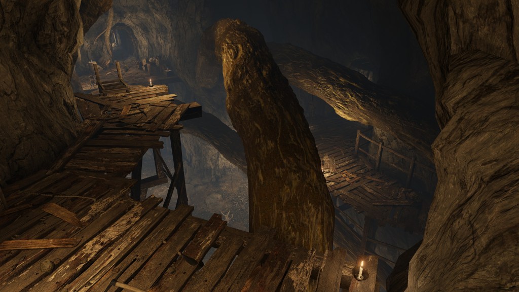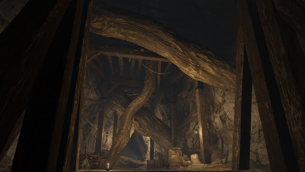 In the end, exposure trumps all. In fact, the phenomenon is dependent upon proximity to the source more than anything. Whether close to one or both mediums, only the Erdtree’s immediate vicinity on the plateau may suffer the full effects of gold. The efficacy is evident on the fringe. Gelmir’s environment on the far west side lacks the same gold veins, yet the trees and bushes — what haven’t burned to a crisp — are the same as on Altus; only the grasses deep in the mount are exempt from yellowing. The Erdtree has not permeated as pervasively only because of the competing volcanic power, the combination of roots and rays nonetheless effective at that distance. We witness such competition with grass at poison or water’s edge as well. Similar behavior can be observed at the Mountaintops of the Giants; gold smithing stones lootable from the miners of Yelough Anix Tunnel, located in the southern edge to the Consecrated Snowfield. Not even the ice and snow are able to completely offset the goldening within the tree’s vicinity.