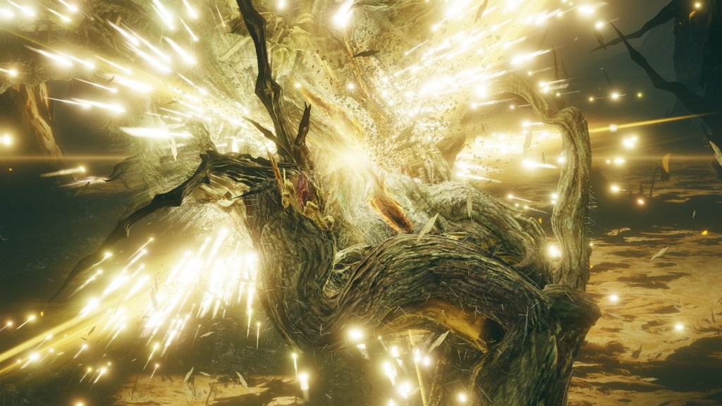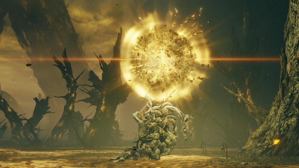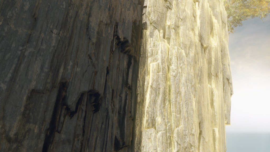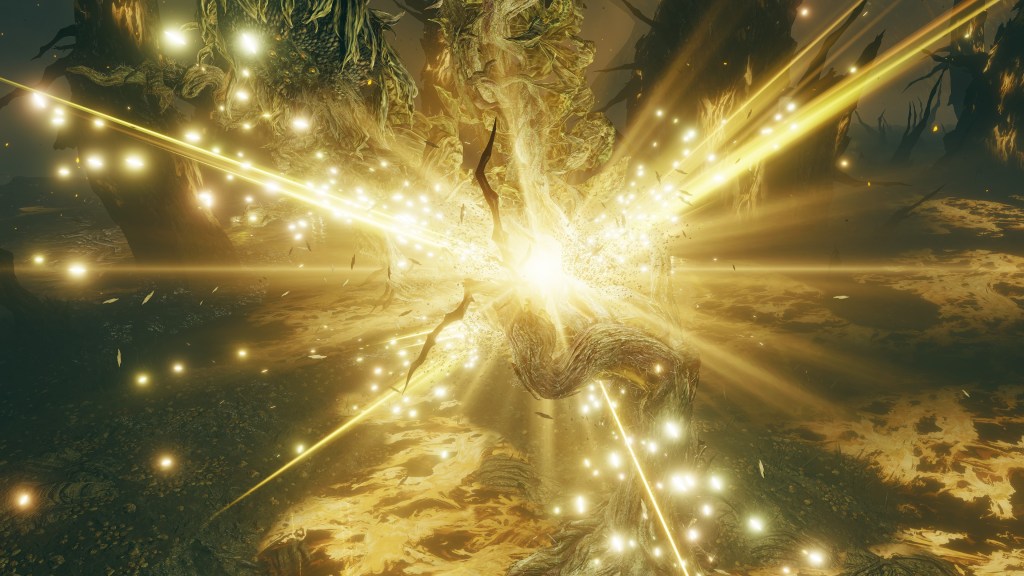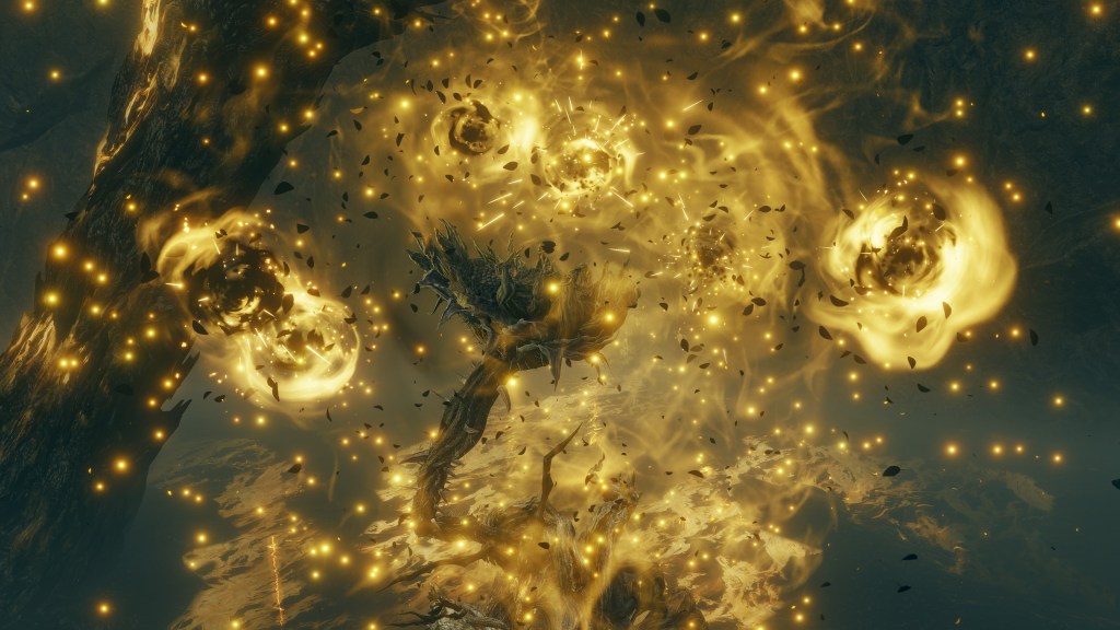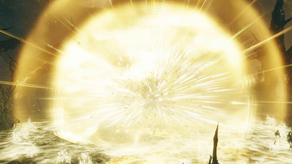 Even so, the two trees are unquestionably linked. The golden radiance has been trickling out because the Scadutree shattered from within, launching shrapnel across the land for the Erdtree faithful to later collect. The larger, weightier fragments simply dropped to the Scadu Base along with the gold, spreading more thorns in response. Meanwhile, this has left a long, glowing split along the length of the main trunk, with similar splintering “gashes” manifesting in the Scadutree Avatar — fitting, since when mimicking the tree to build up a massive explosion, the concentrated holy power leaks from that damaged section before bursting. Indeed, the event seems to coincide with the golden shockwave felt after the Elden Ring itself shattered, the same wrath of the Erdtree expressed by its own body on Altus Plateau. A shadow can only be cast in the presence of light, so the Scadutree’s existence is dependent upon the Erdtree and ultimately the Elden Ring. While it shows no reaction to its counterpart burning, the shadow tree will soon wither should the golden tree actually expire.