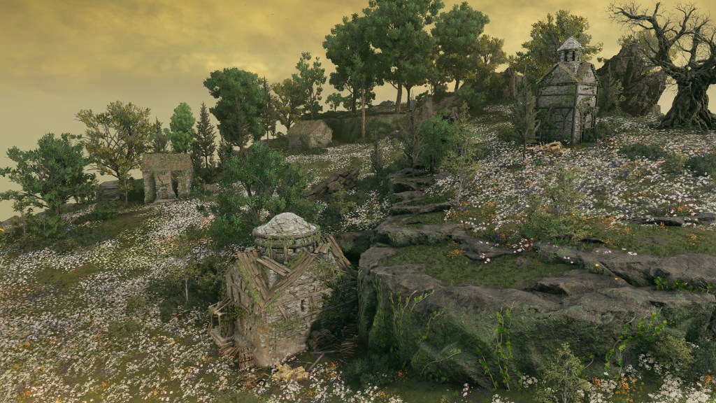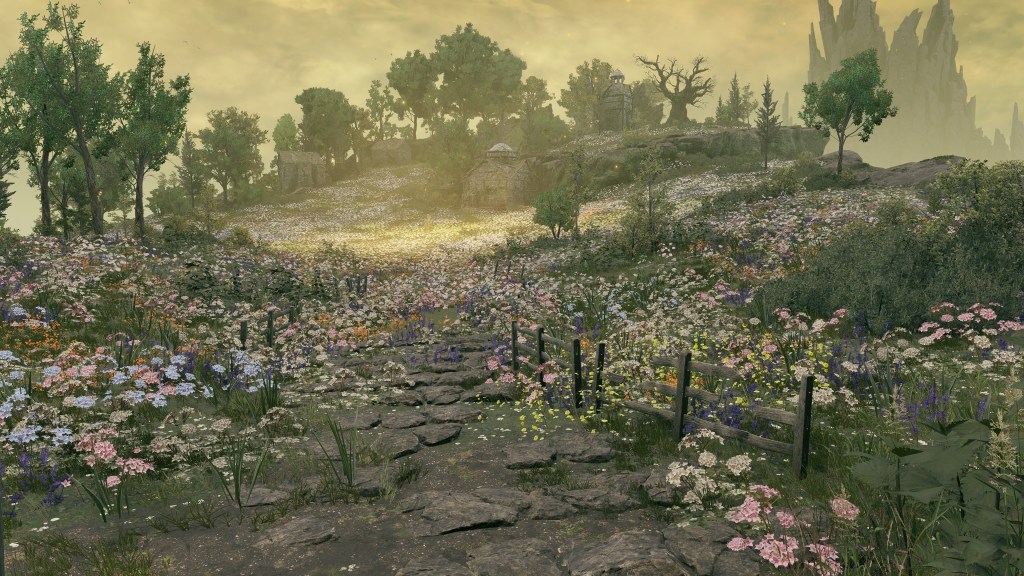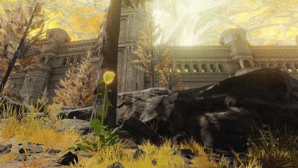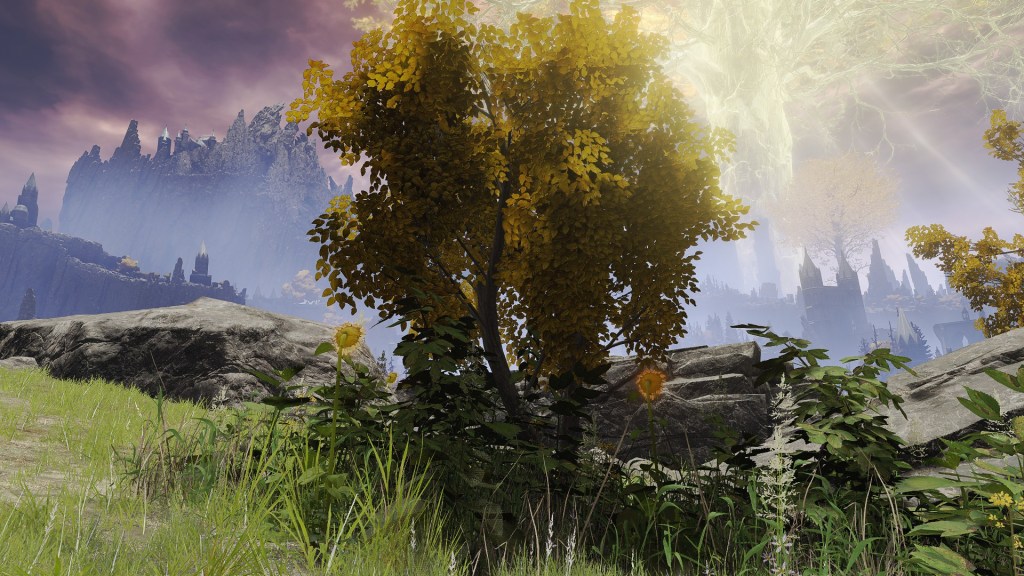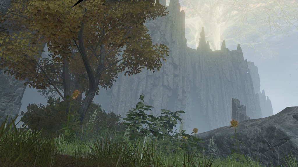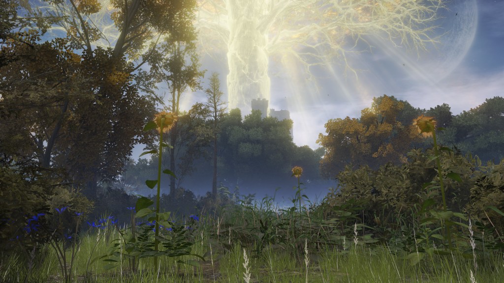 We can harvest random individual sunflowers — tarnished and otherwise — all across Altus, suggesting that the tree itself produces this vegetation. Adding to the insinuation, small patches of consistently tarnished sunflowers grow erratically throughout other lands, from Liurnia to Weeping Peninsula. Based on the pattern, significant spurts of holy power occasionally get absorbed by land beyond the tree’s typical range to produce the unique flowers; within its vicinity, the same phenomenon is much more common yet diffused. This explains why we don’t see other hallmarks of the tree’s influence, such as yellow grass, coinciding with their every appearance. The sunflower patches are ultimately outliers, anomalies, like small water spatter from a bubbling pot. In this way, the golden sunflower is just another example of the Erdtree’s disproportionate effects on the plateau’s ecosystem, an entire new species of plant emerging thanks to the power of the Elden Ring.