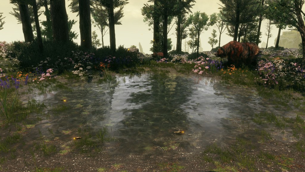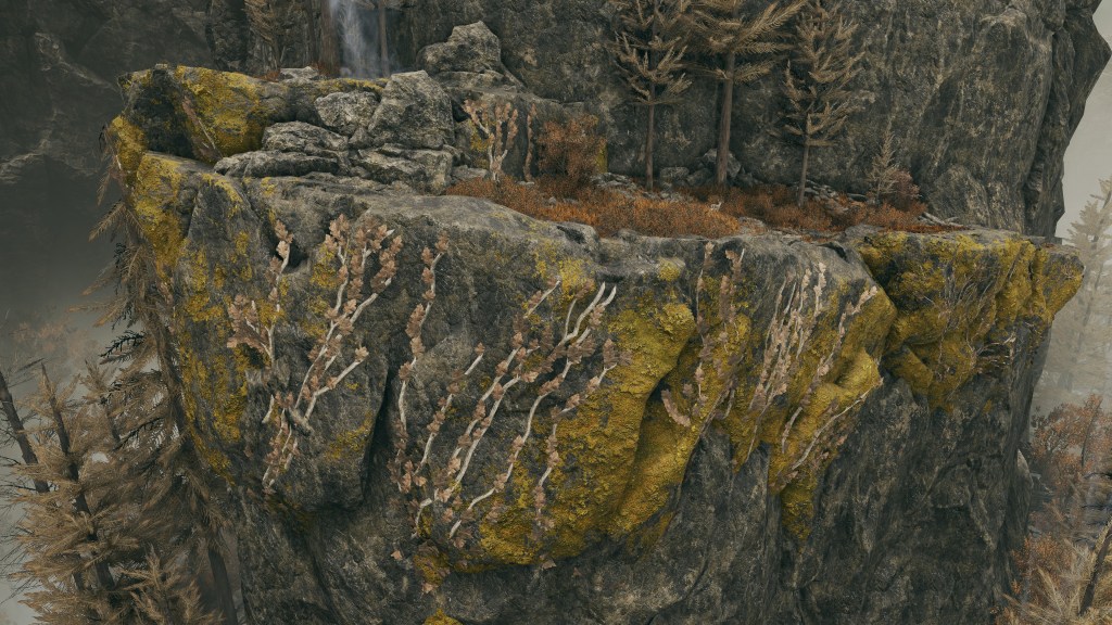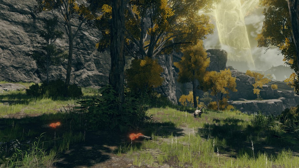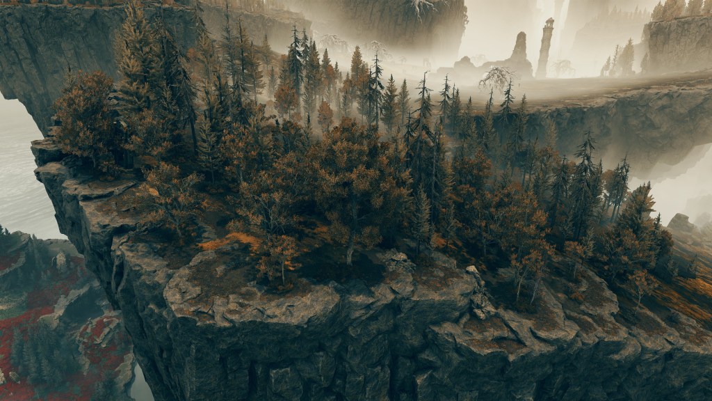 Much like with the Elden Ring in Farum Azula, the power of gold has seeped into the earth surrounding the tree, with more obvious results. Besides the gold smithing stone plentiful across the plateau, the earth in general possesses gold veins, and almost the entirety of the plant life exhibits yellow foliage down to the shrubs and grass. This includes the conifers, which are otherwise exceptions to this yellowing phenomenon. Not even trees from the chilly Mountaintops can resist the Erdtree’s warm influence so close to the source. Greenery which remains so might concentrate the gold entirely to one part, such as the Altus Bloom. In a similar vein, the rowa fruit so prevalent across the Lands Between has also seen peculiar changes on the plateau. The green bush appears to channel all the power into the golden rowa, causing its juices to taste sweet like honey. Considering the effects of the tree’s rays abroad, this sort of evolution isn’t a surprise. But, such effusion of gold throughout the ecosystem likely began well before the Erdtree towered over the lands.