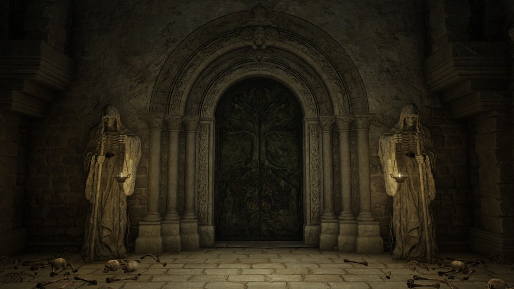 If this is their main purpose, then it is no surprise that Erdtree Burial became formalized for any under the Erdtree’s dominion. The full extent to this new cycle of life and death certainly hasn’t eluded its worshipers — doors protecting the main chamber are universally adorned with a relief of the tree, robed figures offering lumps of gold to the roots while new people form out of the branch tops. The faithful well understand that the blessing they retain in death theoretically contributes to the growth of future progeny, as highlighted by those born on Altus Plateau. With the Golden Order’s emphasis on life, nothing could be more important for contextualizing death. In fact, Erdtree Burial is considered an honor, individuals like Lhutel and Kristoff receiving one for meritorious deeds despite almost definitely not perishing in the course of their actions. The descriptions of hero’s runes similarly highlight how these brave warriors simply drop dead after finishing their heroics with the Erdtree’s grace. Even assuming that gold extended their life, this marks a change in mentality toward demise, focused on the how.