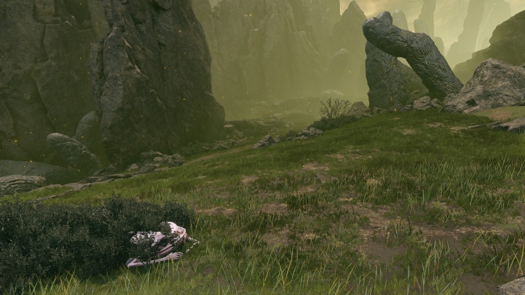 As of the current day, the Shaman Village is deserted. Although the overgrown hovels themselves look undamaged, knocked-over haystacks and piles of wooden rubble betray how the properties were ransacked. Doors have likewise been boarded shut to keep anyone in the future out. It appears that the villagers were rushed out of their homes unwillingly, the only one left behind being the Grandmother — who has turned into a tree within a snag at the hamlet’s highest point. A local message confirms their abduction, and where they went is obvious. The Hornsent spirit in Bonny Village claims that shamans are “born” to become jar saints, and we do see a woman core to every saint, eyes obscured like the Grandmother. On that note, we find an identical dendrified woman missing a head on Bonny’s outskirts, reaffirming their presence. Using shaman bodies as the base for jar saints would also explain why the sordid task fell to a village which sits relatively close to the shaman homeland. In fact, everything was set up to filter the women through as soon as they were brought down from their plateau.