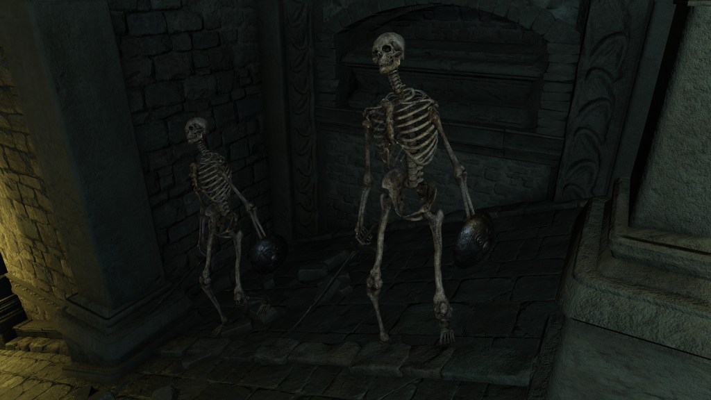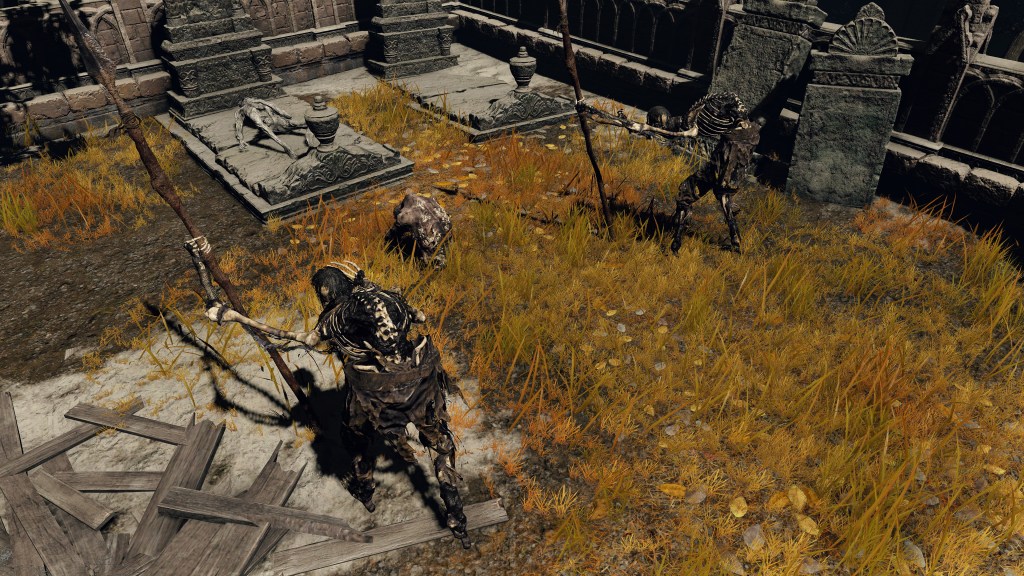 Some might have also begun to notice the effects on the dead. Only the skeletons rising from the Sun Capital graveyard in Leyndell’s outskirts — in other words, within the closest vicinity of the tree — possess golden bones in the entire Lands Between. The obvious cause is their proximity, though the same doesn’t hold true for skeletons inside the Erdtree capital. That, however, may be because those bodies were buried in the Lower Quarter, resisting goldening due to their Nox heritage or some other mitigating factor; the residents have managed to somehow preserve their green trees, after all. No body interred deeper underground in a catacomb has seen their bones turn gold either, so it clearly only affects humans left on or near the surface, perhaps long after the flesh has rotted away. If so, then it is possible that no one noticed any effects on the skeletons until after they began climbing out of the earth.