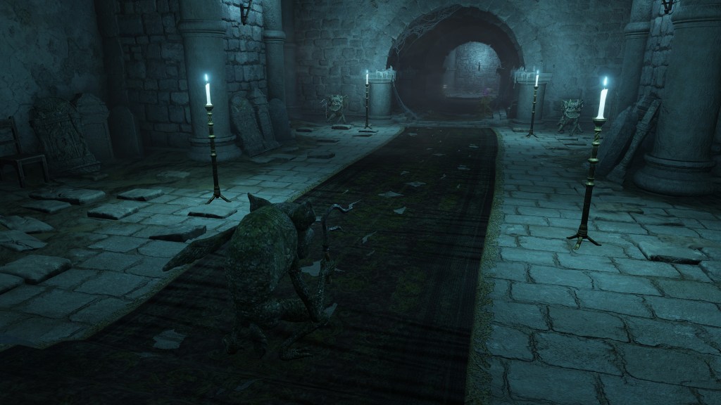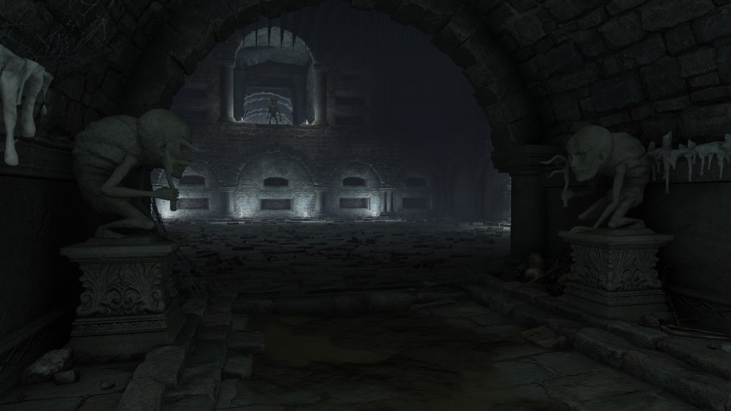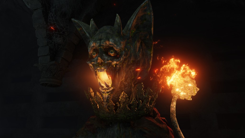 On that subject, desecrating the graves as the faithful await assimilation is treated with appropriate enmity. Catacombs commonly feature imps. Occasionally, these demonic figures are genuine stone statues for decoration, but most are golems acting as guardians for the tombs. True to their names, they use their deceptive appearance to their advantage, either playing the part of mere grotesque or otherwise lying low and out-of-sight in order to ambush the unsuspecting graverobber. Cementing the association, their peculiar daggers shaped to lacerate flesh with their dual hooks has become known as their forked tongues. Despite these nimble golems’ reliance on surprise, their generic form is actually well known as guardians outside catacombs. Besides being the universal model for seal statues, some imp golems adorn rooftops in the Erdtree capital’s Upper Quarter, ready to counter more conventional thieves. Perhaps that is why they possess such a variety of faces, but they are iconic regardless.