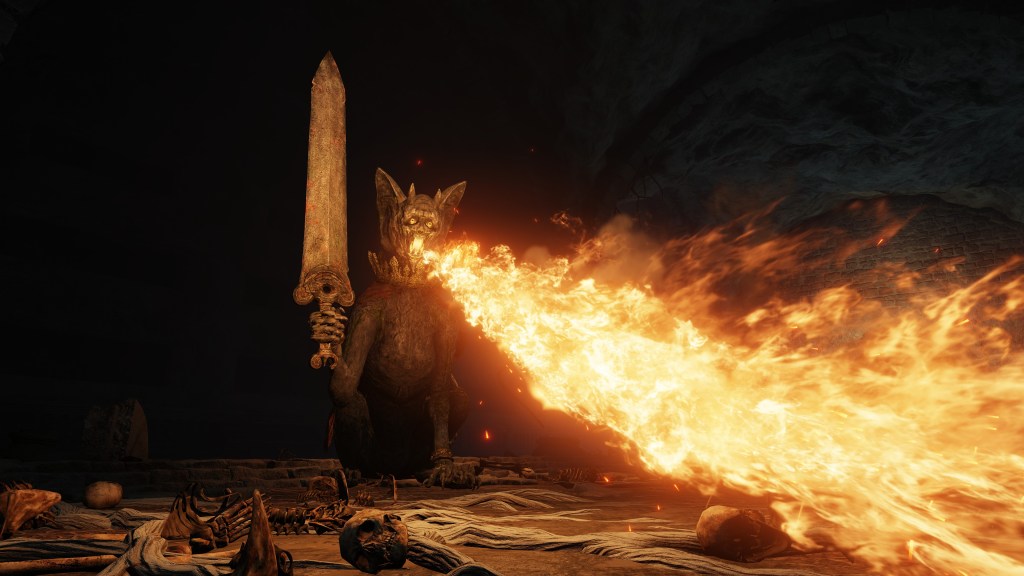 Commonly leading these imps are the Erdtree Burial watchdogs. These golems take the shape of something more feline than canine, with as many as three heads like the mythological guard dog of the Greek underworld Cerberus. Each wears the stereotypical regal red cloak and crown to convey them as the kings of their respective catacomb. They wield either a stone greatsword embedded with their watchful eye or a staff enjoying the weight of a great hammer. The latter is a kind of “sacred staff” (錫杖) normally employed by clergy, thereby solidifying the hallowed duty placed on these faux kings’ shoulders. Their design accommodates attacks with their clubbed tail, which is lit aflame through the same mechanism as their mouth flamethrower by default — though modifications are made to suit the maker or environment. Even if the more deadly constructs, the years have been less kind, their moss-covered and decrepit frames no longer functioning smoothly. So bad is it that they themselves have been subject to graverobbing, their swords missing the assumed gem used for the symbolic eye.