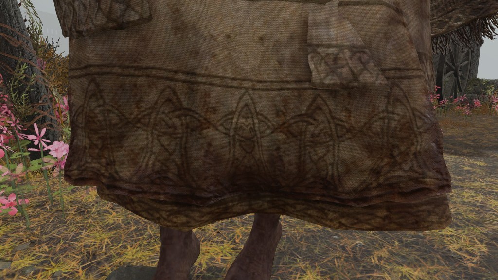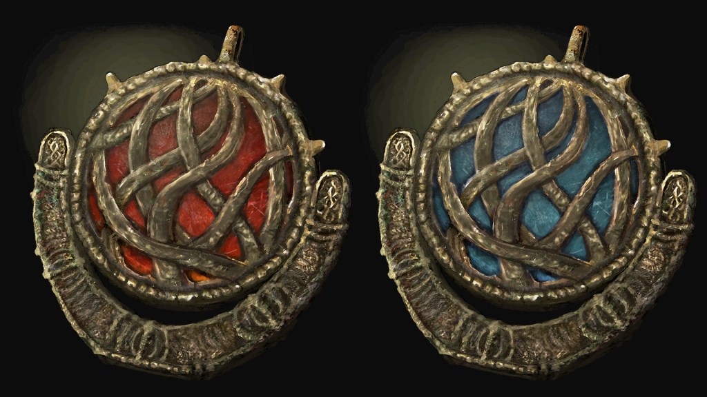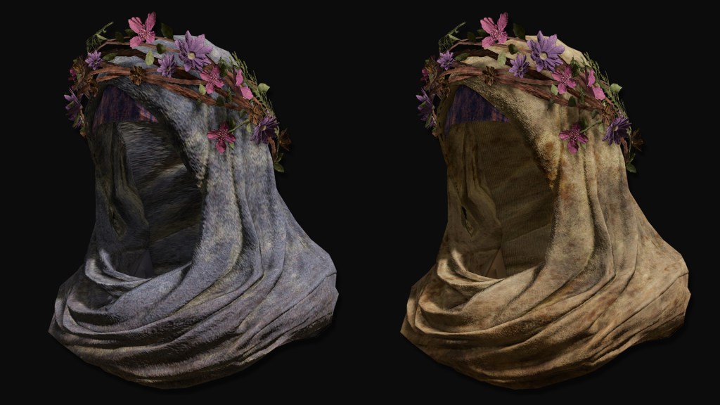 The obvious answer is that the priests picked up the idea from the area. And with the Shaman Village being the only “folk” settlement in the vicinity, the grease could only have been sourced from there specifically. In other words, Marika’s home must have been part of that wider culture connected to Gelmir’s old faith. The village’s location would have bordered Altus Plateau originally, putting it on the fringes of any cultural diffusion originating from the land. Likewise, the most ubiquitous symbol of Erdtree worship in the Lands Between is an abstract representation of their subject of worship in the form of a cross; even Marika’s veil incorporates its. And yet, the garb worn by women in the festival features elements of this “Erdtree cross” in the design. The one aspect missing, of course, is the Elden Ring at the crux, key to demonstrating gold as the source of the tree. But that is to be expected if the pagans were the origin of the style, Marika drawing on those villages’ shared art to create her new religious symbol. All of that points to the shamans adopting the ritual killing from neighboring Altus.