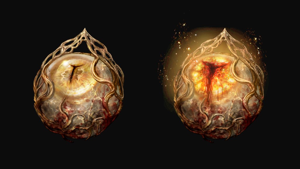 Removing Destined Death wasn’t the only manipulation of the Elden Ring. Both Marika and her other half Radagon are associated with Elden Runes, whose form essentially serve as a personal crest. This includes magical contexts, the runes’ shape carved into the eye seals each creates to burden its bearers with a curse. Why adopt these symbols specifically? The name Elden Rune implies that it retains connection to the Ring, and we can see both in the title screen and promotional material; the two runes also manifest as part of the mended Ring during most endings, though obscured inside of Marika’s body. Admittedly, neither’s Elden Rune appears in iconography of the Ring, even above the entrance to the Erdtree — they are iconic to Marika and Radagon alone. And yet, both runes appear part of the shattered Ring during Radagon’s boss battle. Therefore, these Elden Runes were never broken off from the Elden Ring, like the Great Runes. By all indications, they have always remained a part of the whole.