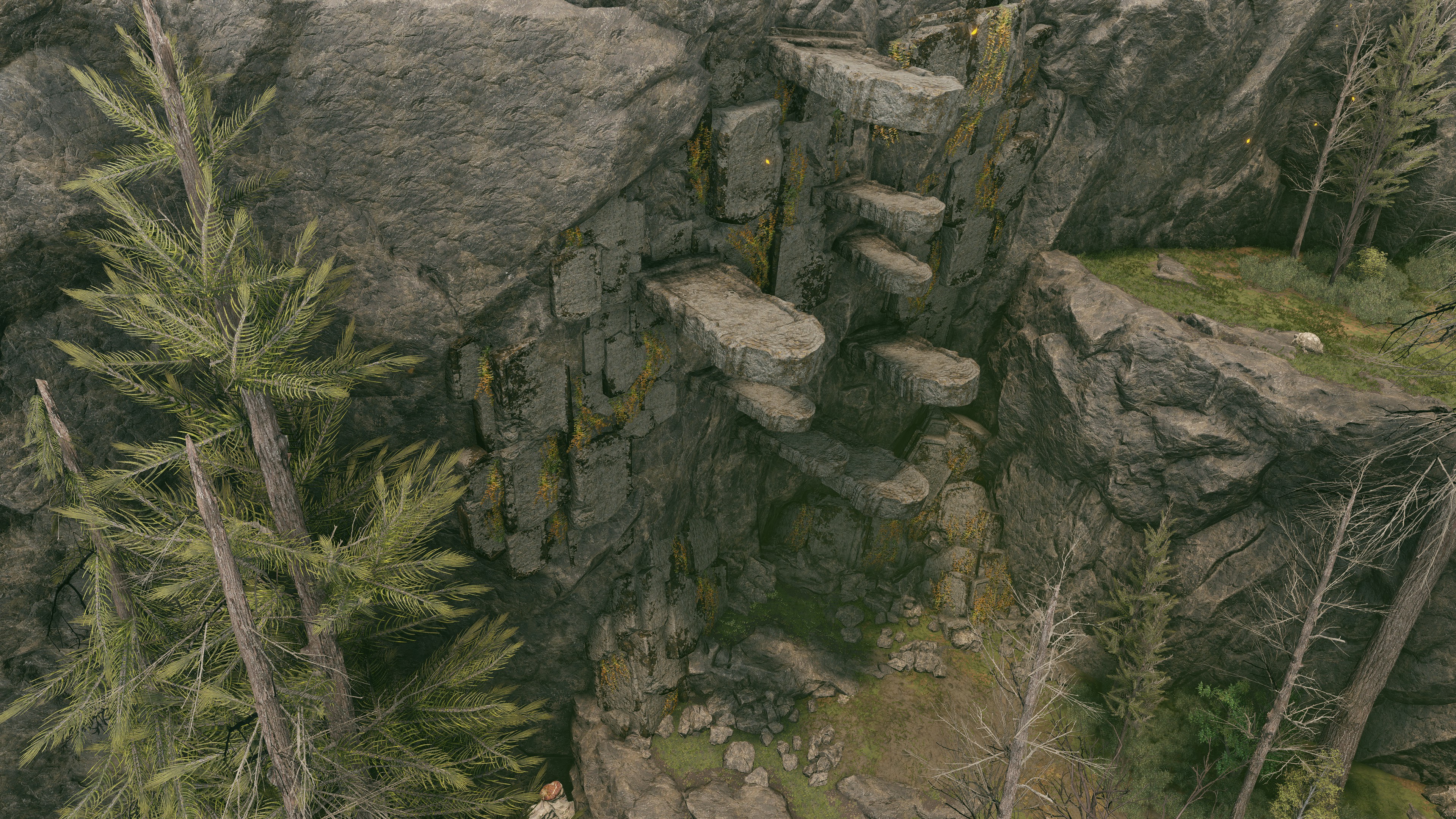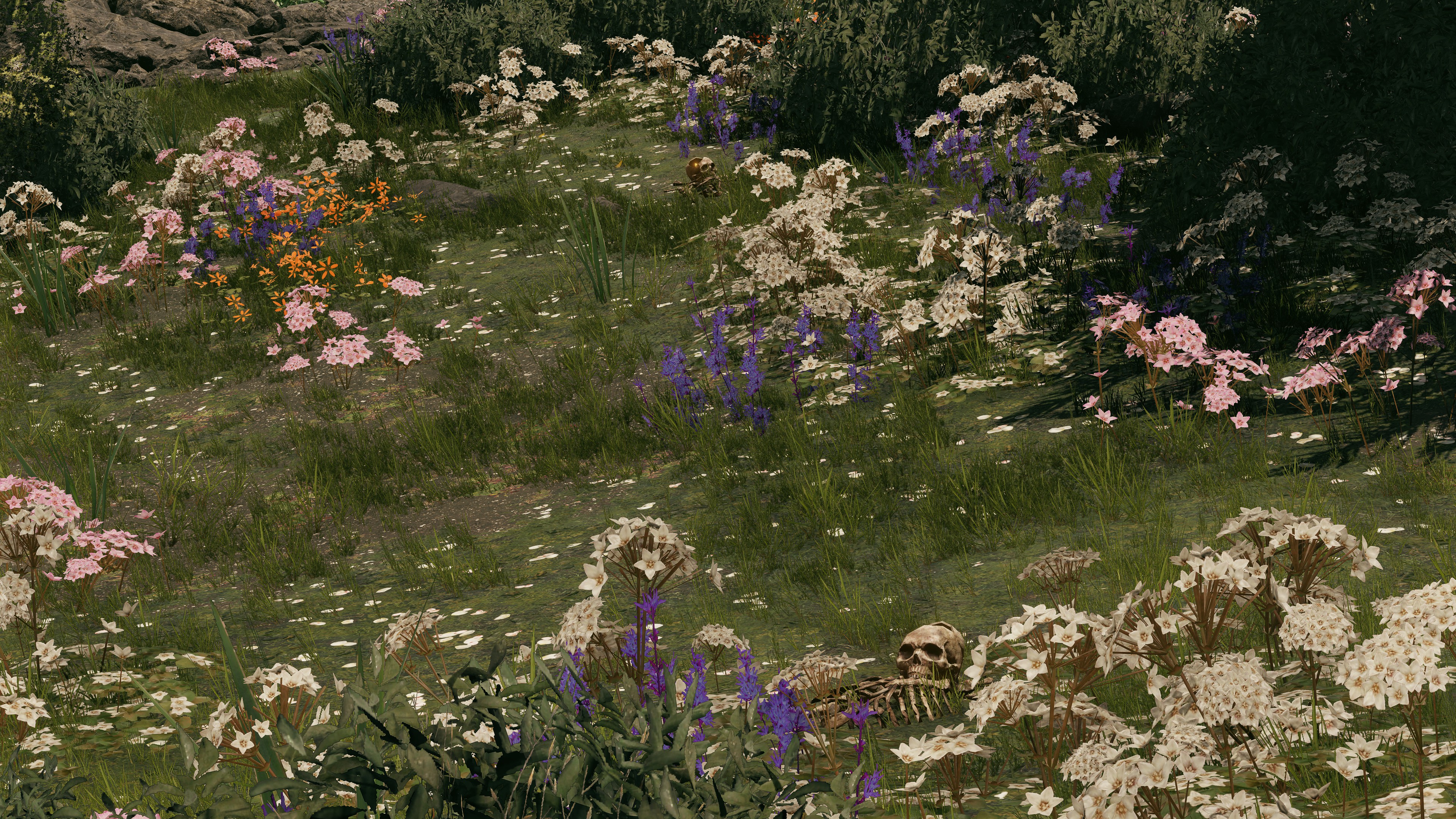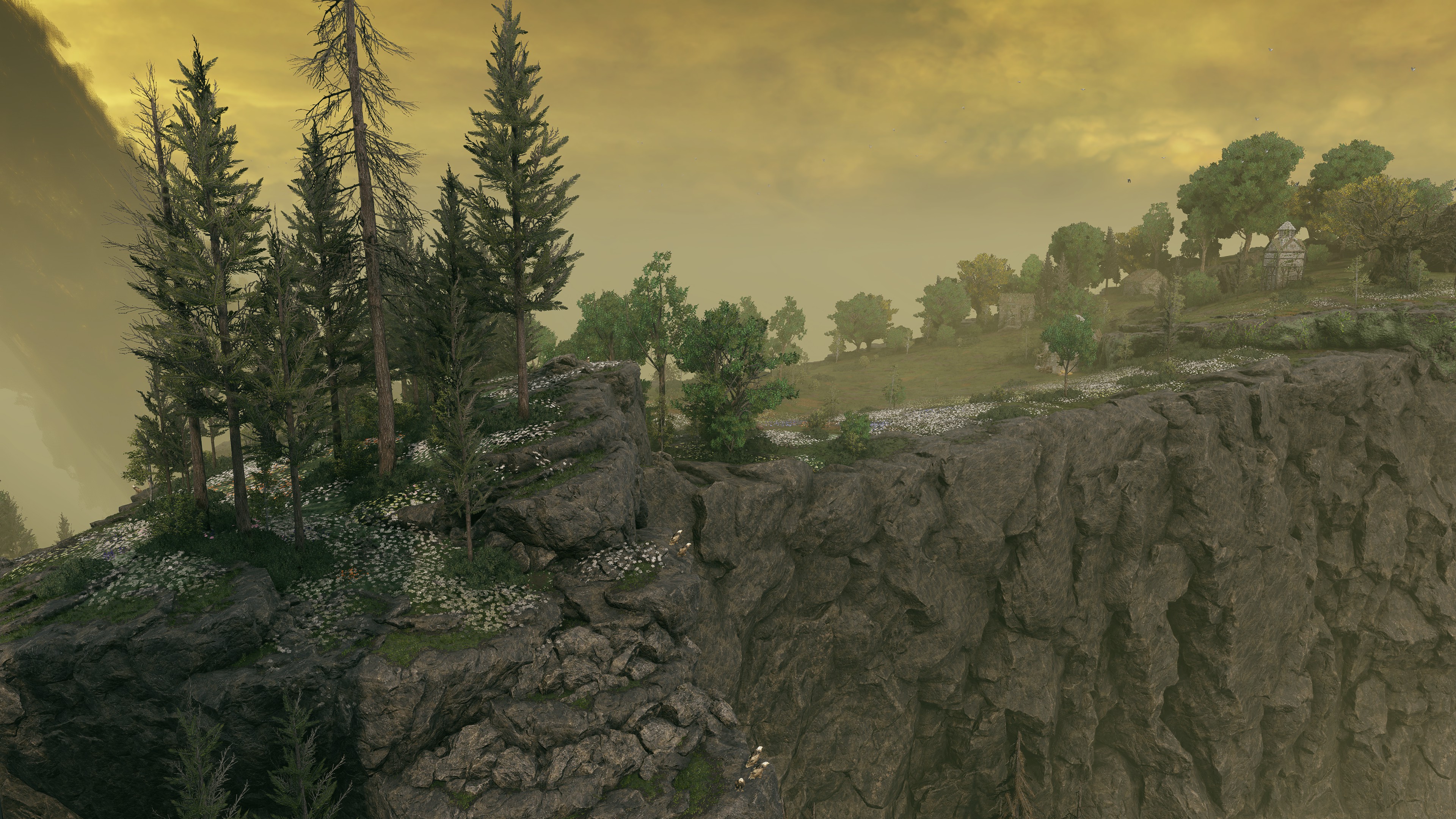 Putting aside the foliage, we do see proximity to the tree affect the land. Upon reaching northern end to the Gravesite Plains and Scadu Altus, rock faces become visibly infused with gold. The ruined forge in the northern plains likewise hides gold smithing stone, with the forge on the plateau containing even more. Scadu Altus is also unique for the golden color of its tallest grass, though this curiously doesn’t extend to Scaduview behind the Shadow Keep. Even still, golden fireflies lurk in a pond with that backyard view. There are also golden skeletons rising from the graveyard in front of the Keep, mirroring those buried outside Leyndell. Overall, the environment seems to absorb more gold the closer one is to the Scadutree. Driving home the notion is the Land of Shadow incantation — subsequent to weaving its thorns of rejection through the earth, the Scadutree Avatar begins launching “pebbles” of gold and shadow as if it were glintstone. It is undeniable that the Scadutree mimics the Erdtree in these other respects, so why not with coloring the plants? Once exposed to shadow, the center of the Lands Between gradually transformed.