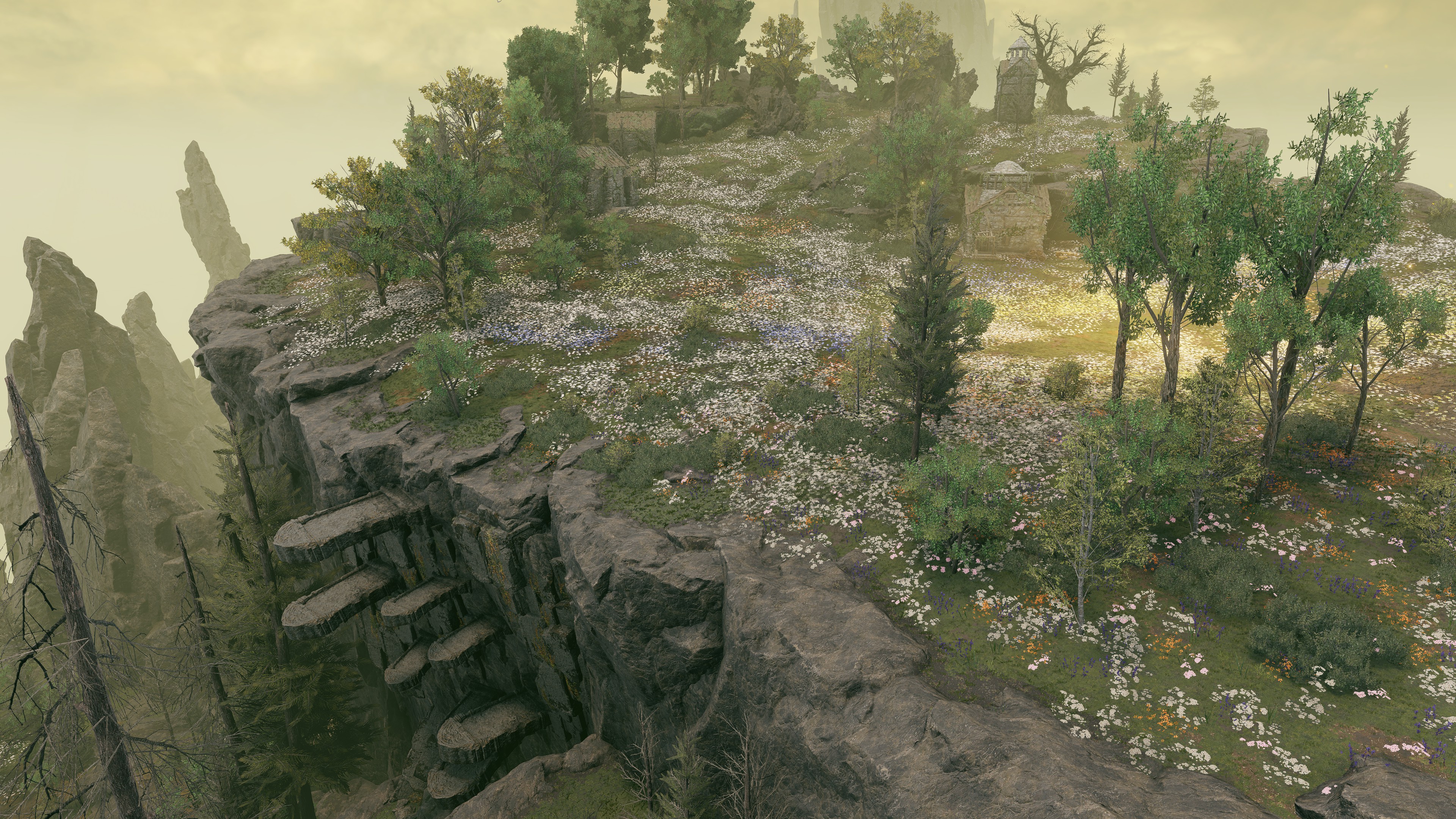 Much like with the Elden Ring in Farum Azula, the power of gold has seeped into the earth surrounding the tree, with more obvious results. Besides the gold smithing stone plentiful across the plateau, the earth in general possesses gold veins, and almost the entirety of the plant life exhibits yellow foliage down to the shrubs and grass. This includes the conifers, which are otherwise exceptions to this yellowing phenomenon. Not even trees from the chilly Mountaintops can resist the Erdtree’s warm influence so close to the source. Greenery which remains so might concentrate the gold entirely to one part, such as the Altus Bloom. In a similar vein, the rowa fruit so prevalent across the Lands Between has also seen peculiar changes on the plateau. The green bush appears to channel all the power into the golden rowa, causing its juices to taste sweet like honey. Considering the effects of the tree’s rays abroad, this sort of evolution isn’t a surprise. But, such effusion of gold throughout the ecosystem likely began well before the Erdtree towered over the lands.