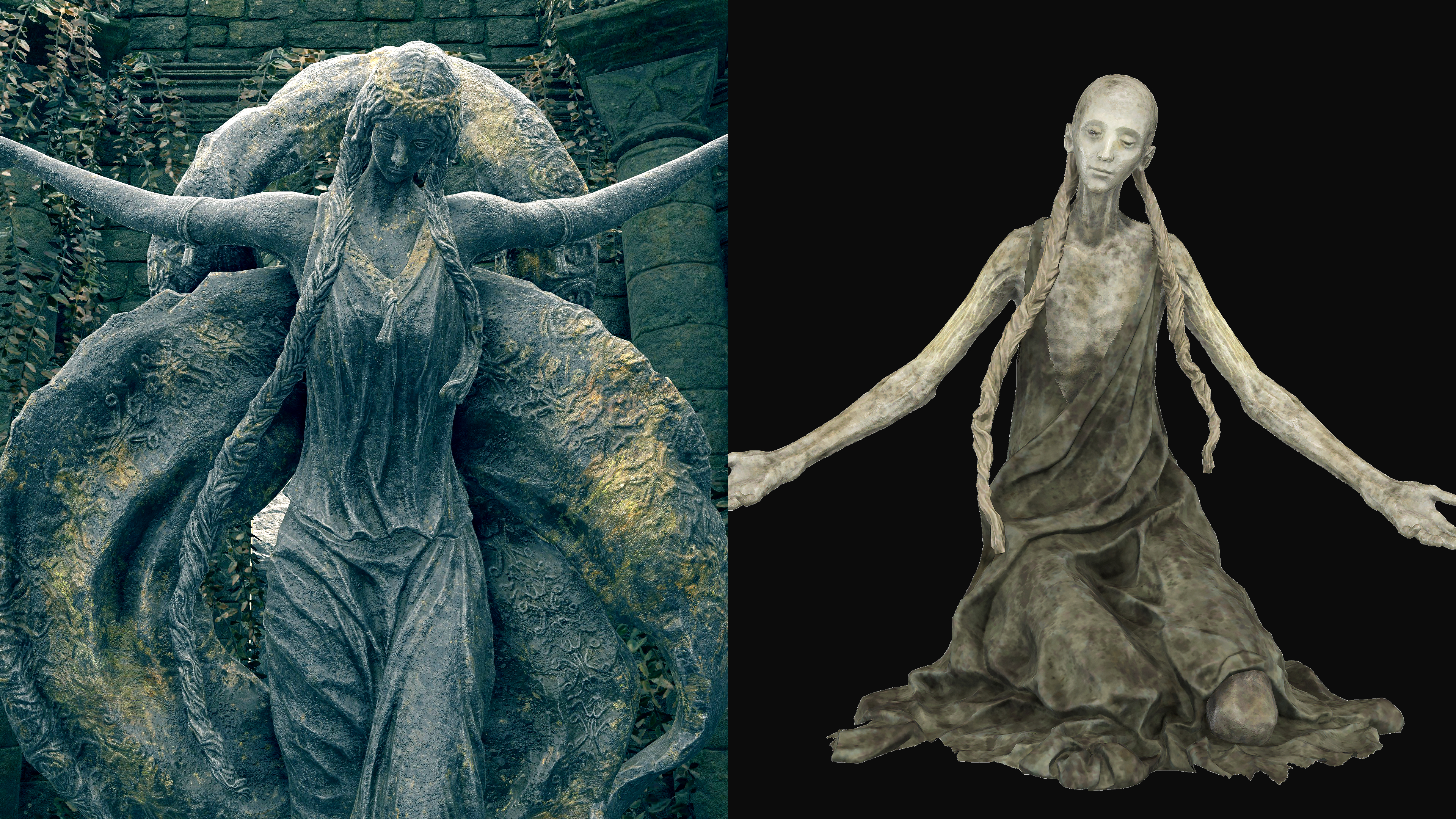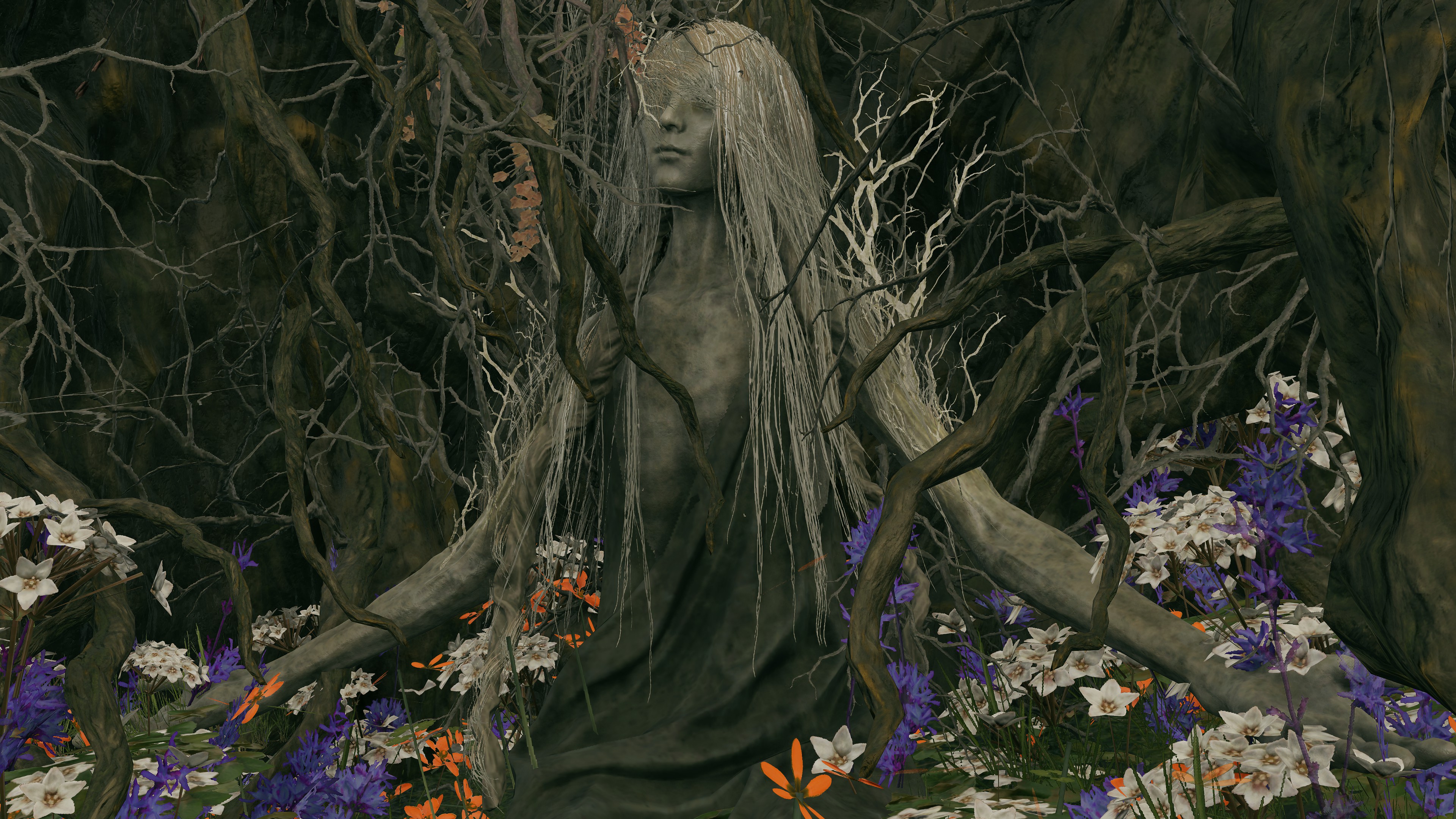 This means that any hypothetical Greattree distinct from the Erdtree can only be surmised from necessity of circumstance. For that, fans point to statues of a bald man picking a flower from among various branching on a stalk. This flower is depicted in gold at the Fortified Manor, thereby definitely representing the Erdtree. From this, it is suggested that the Erdtree is the product of horticulture, a grafted or competing branch in the Greattree selected out to become the singular defining aspect of the plant through coppicing. To bolster the inference, they point to the two variations of this statue, one with the many other branches growing wildly; another, the branches mere stubs. However, this appears to flip the intended sequence to the images. Rather than coppicing, the statues depict the singular stalk already growing branches suddenly explode in growth from the roots, larger flowers blossoming at each tip — including the central flower initially picked. Such dynamism is consistent with a tree derived from the source of life itself. It is not evidence of selective breeding.