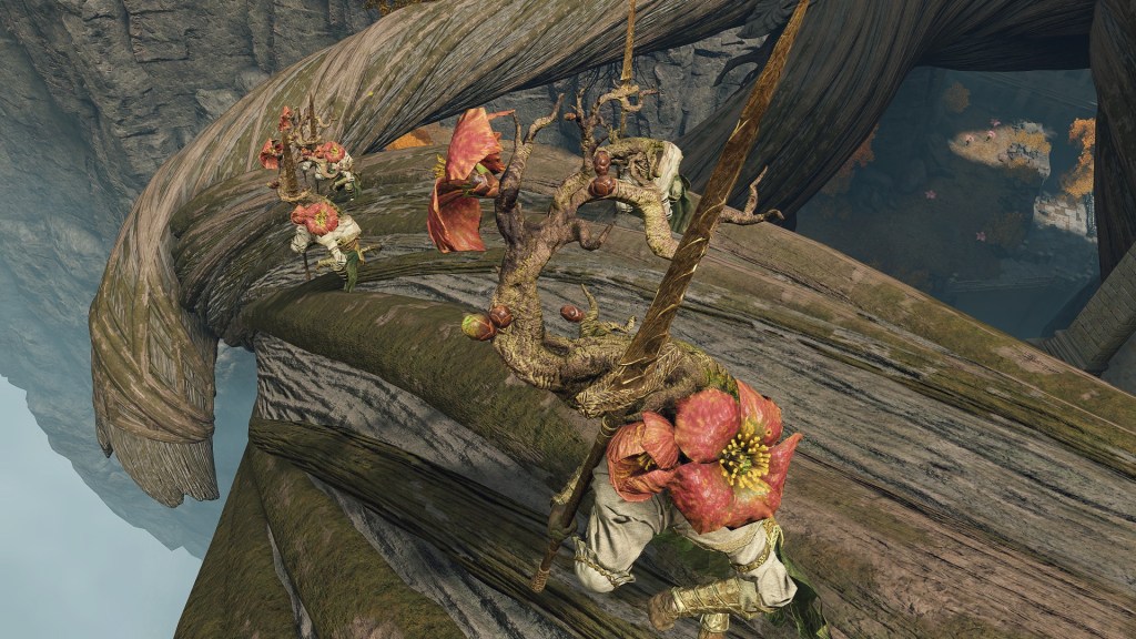 Failure to fulfill the pact comes at a price. We see that all the guardians have trees growing out of their backs. Those closest to the original Erdtree have advanced the most, blossoming blood-red flowers; additionally, damaging them results in the tree growing with even more blooms, their swordspear turned into a heavy club from all the overgrowth. This indicates that the pact does involve their bodies harboring some piece of the Erdtree, but the actual growths aren’t part of the exchange. Rather, the flowers are proof of the guardians breaking the deal. This “breaking” (綻び) refers to something coming apart, like a ripped contract, as well as something opening up, like a blooming flower — the wordplay in full effect with the guardians. They did fail to protect the Erdtree from Marika when she shattered its heart, the Elden Ring, so this fate is their punishment, affecting the ones immediately at fault first before slowly spreading outward to the others across the Lands Between. What makes this a punishment? The gradual destruction of their human existence.