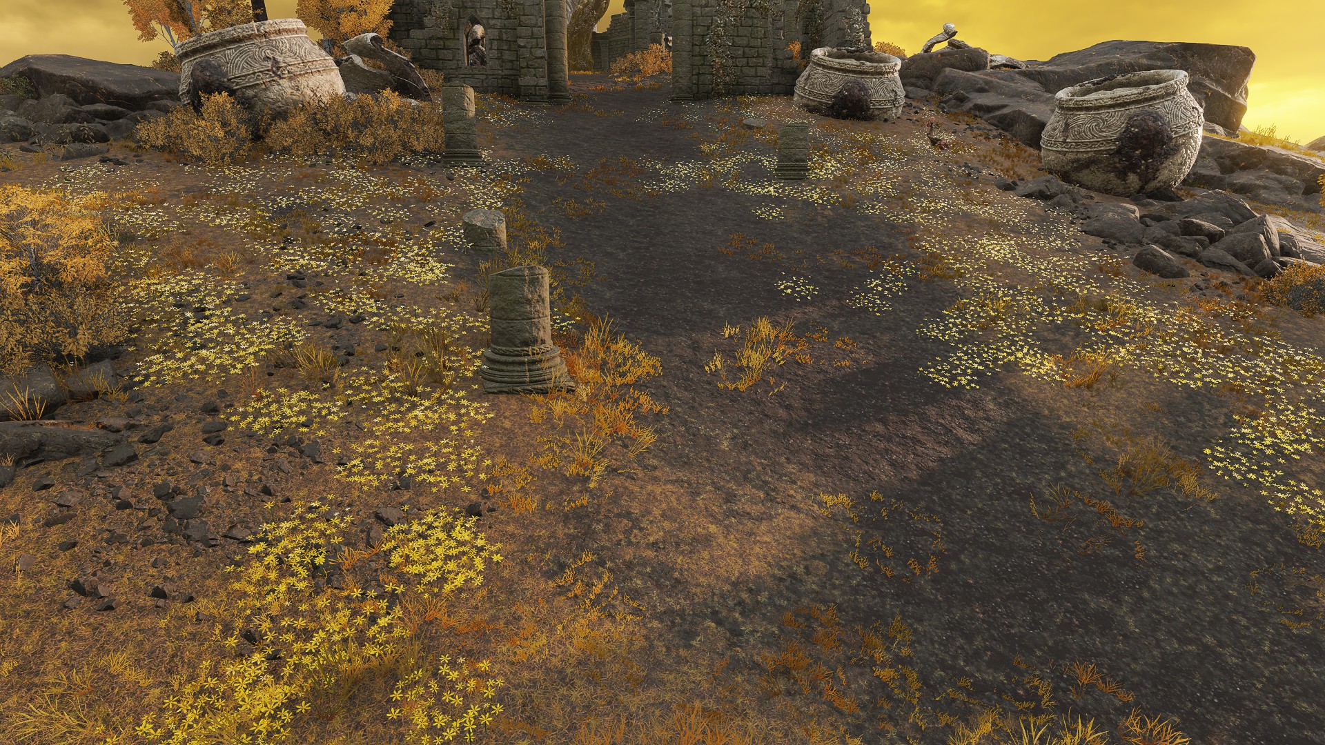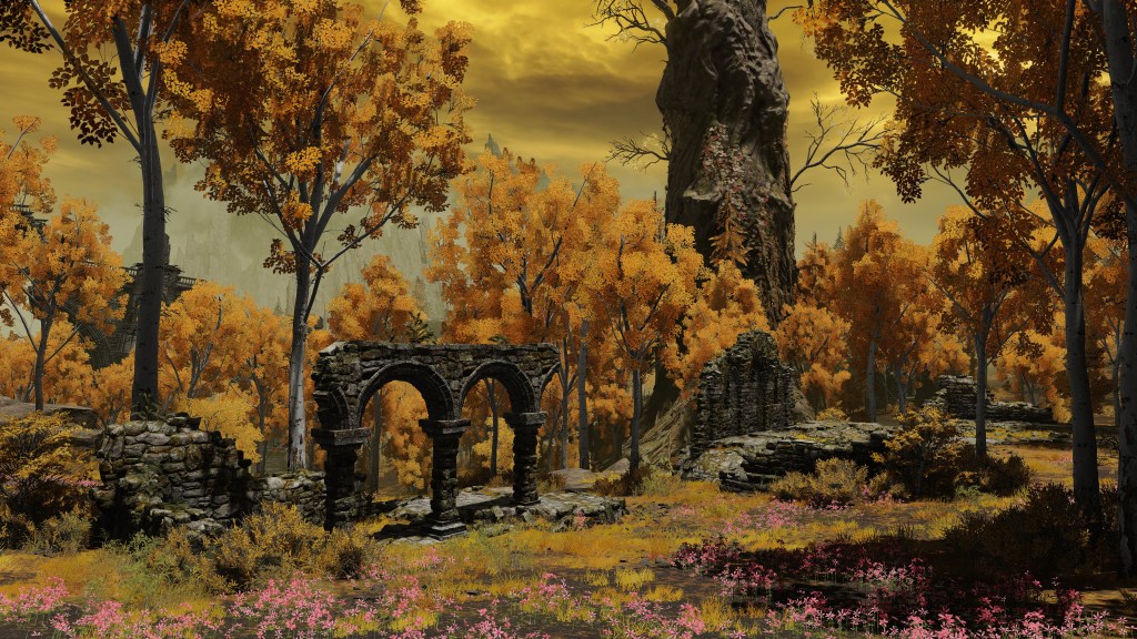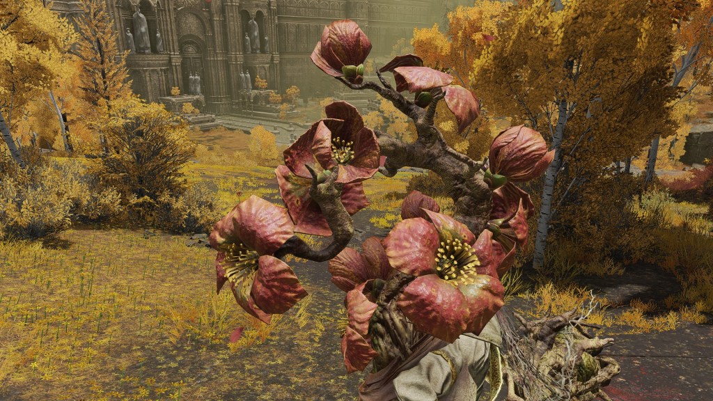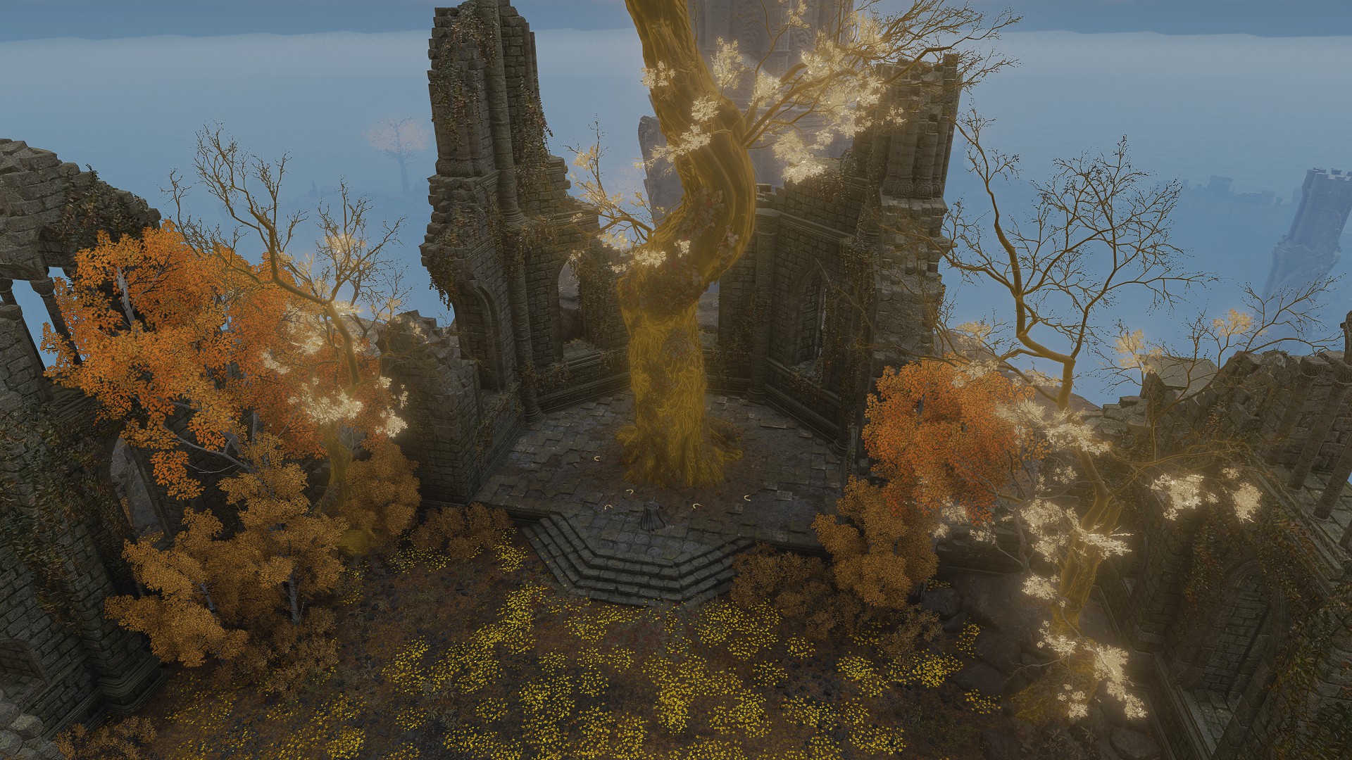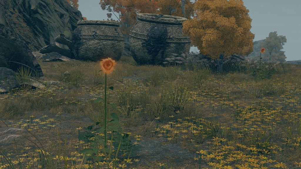 These lesser golden trees are more than just facsimiles. Whether or not their own glowing yellow leaves can produce Erdleaf flowers, the oversized offspring do exhibit similar effects upon their immediate vicinity. Wherever there isn’t snow, rot, or fog, the land surrounding Minor Erdtrees sprouts yellow grass like at Altus. Trees upon that golden grassland will also be the same variety growing on the plateau, with their more vibrant leaves and whiter bark. At their feet grow not just the conventional golden flowers but even golden sunflowers, albeit solely the tarnished kind outside Altus. The Minor Erdtrees are likewise covered in the same red and yellow-leaf vines as human structures on the highland. Taken together, the mini-golden trees have converted their area into a mini-Altus, the power of gold radiating from a given tree replicating the peculiar evolutionary processes. The lesser trees’ reach is far shorter, but the convergent evolution still highlights identical abilities to the original. It may even be possible to reproduce some of the more idiosyncratic instances.