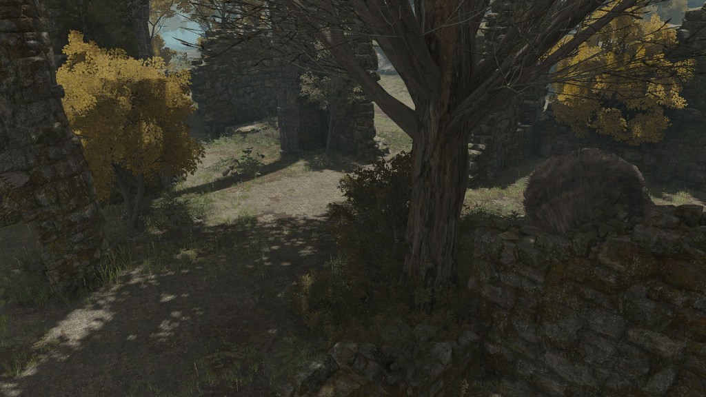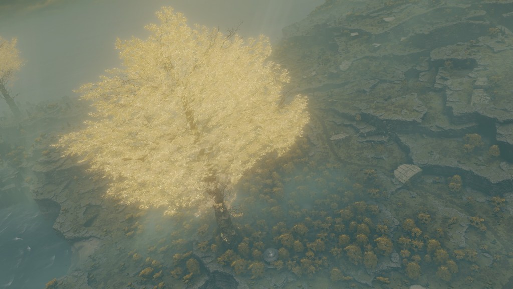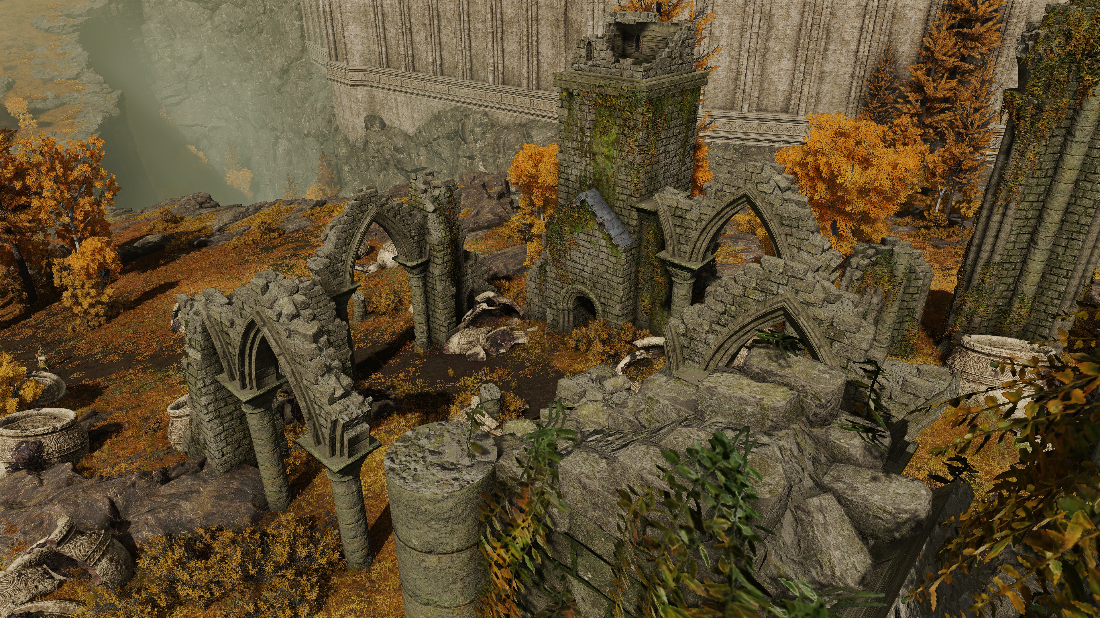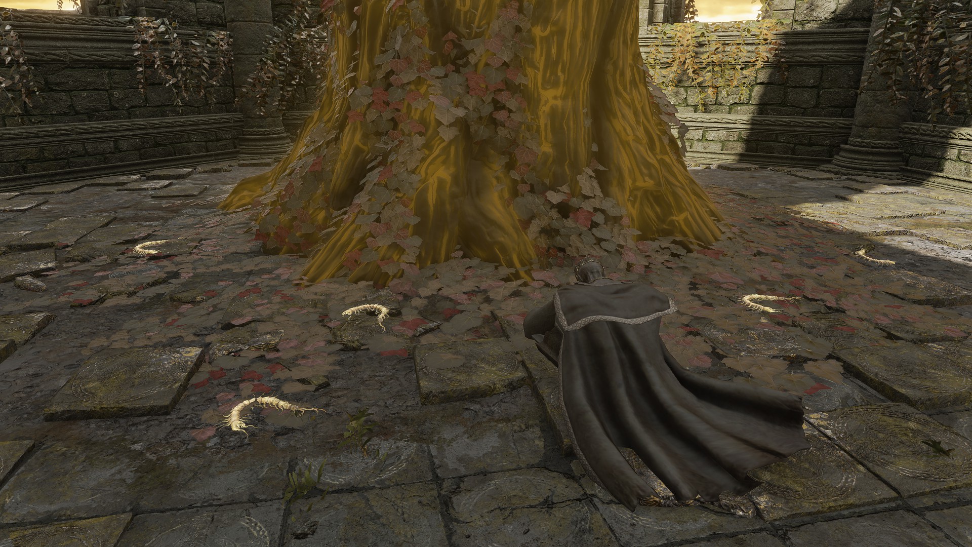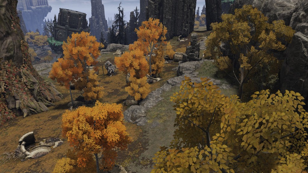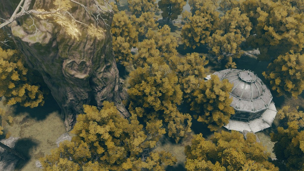 These lesser golden trees are more than just facsimiles. Whether or not their own glowing yellow leaves can produce Erdleaf flowers, the oversized offspring do exhibit similar effects upon their immediate vicinity. Wherever there isn’t snow, rot, or fog, the land surrounding Minor Erdtrees sprouts yellow grass like at Altus. Trees upon that golden grassland will also be the same variety growing on the plateau, with their more vibrant leaves and whiter bark. At their feet grow not just the conventional golden flowers but even golden sunflowers, albeit solely the tarnished kind outside Altus. The Minor Erdtrees are likewise covered in the same red and yellow-leaf vines as human structures on the highland. Taken together, the mini-golden trees have converted their area into a mini-Altus, the power of gold radiating from a given tree replicating the peculiar evolutionary processes. The lesser trees’ reach is far shorter, but the convergent evolution still highlights identical abilities to the original. It may even be possible to reproduce some of the more idiosyncratic instances.