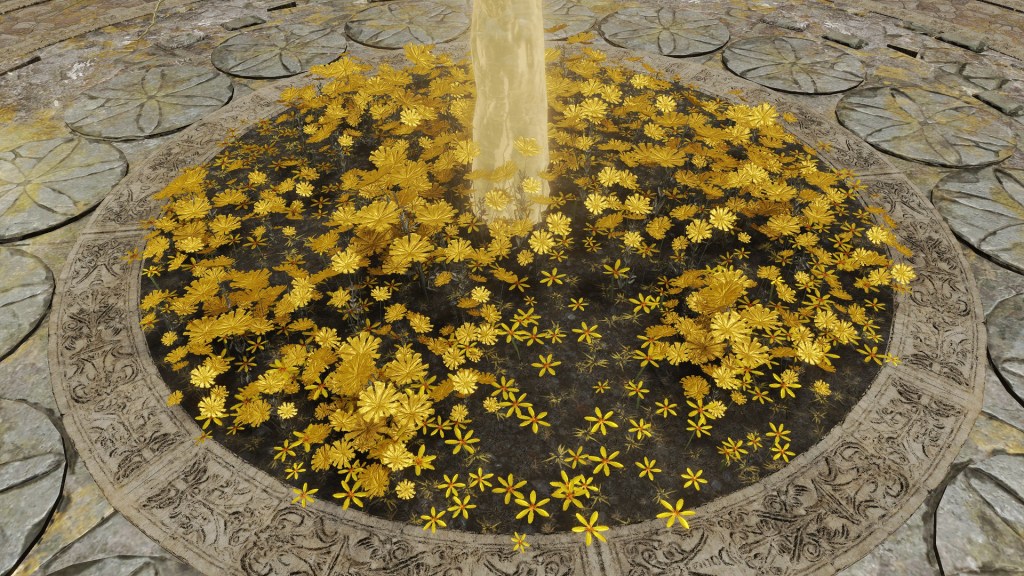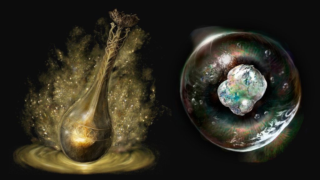 The power contained within these seeds is obvious. Wherever the phantom trees sprout, so too do the golden flowers surrounding Sacred Tears — though only the larger species can apparently survive most environments, the smaller type sprouting on the fringes at merely Altus, Gelmir, and Limgrave. From this, we can infer a simple truth: the seeds are designed to be receptacles for a high concentration of golden drops. This is why we can use them to increase the number of swigs with our flasks; the body of each flask resembles a seed, so incorporating more seeds improves the container’s ability retain the power of liquid grace, thereby reducing the amount of each swig needed for the same restorative effect. Put another way, each seed carries a significant portion of the Erdtree’s strength, which is used to grow new Erdtrees. In fact, these physical trees have a phantom bark likely because that power is being expressed as part of their growth cycle, which can be perpetuated with proper pruning.