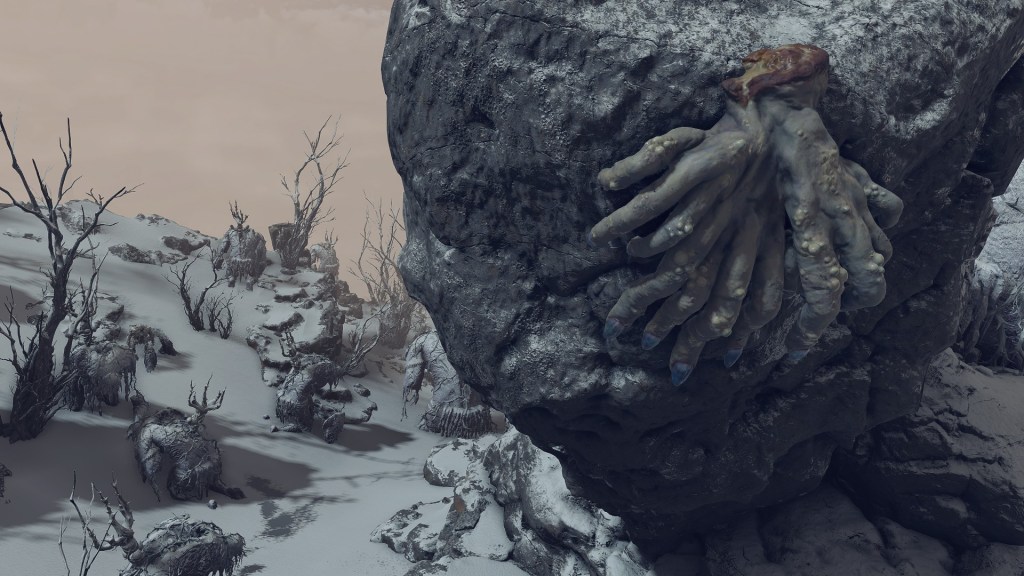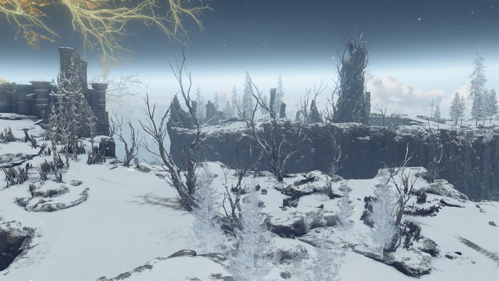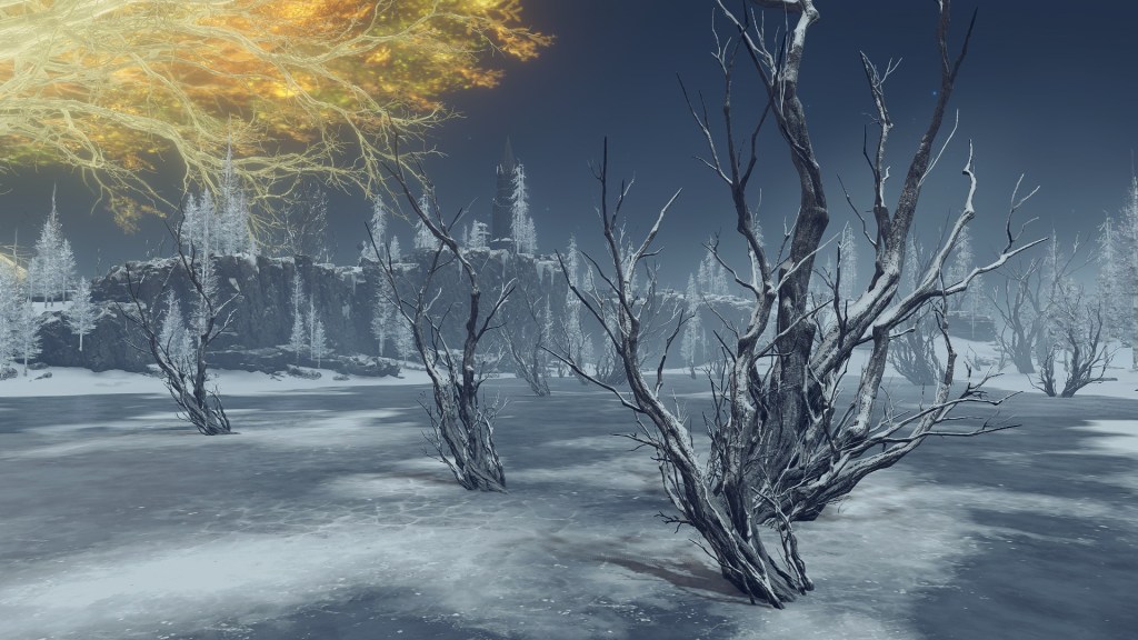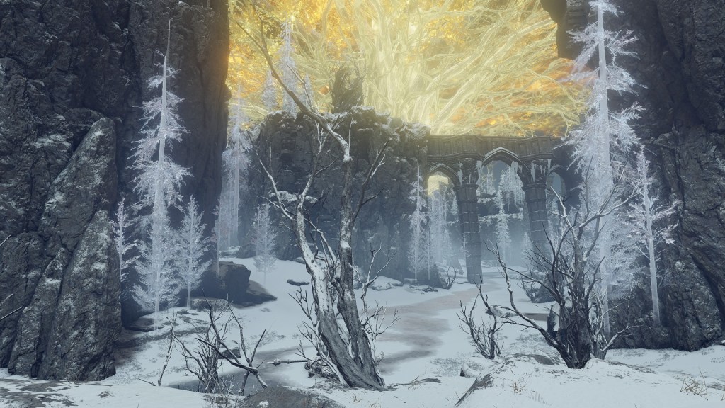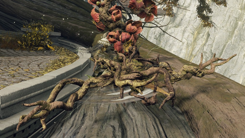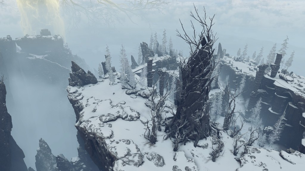 This isn’t to say that the Minor Erdtrees always act at the direction of their parent. For the tree situated upon the Mountaintops of the Giants, a guardian avatar only spawns when we approach. This appears to be in reaction to more recent events, as the tree is clearly dying — and has been for some time. The avatar isn’t even the tree’s first reaction; roots grow wildly out of the ground in its immediate vicinity, simultaneously stretching far and wide in multiple directions. One trail abruptly, and wisely, stops at the valley-top graveyard now overrun with Deathroot to the north. Another reaches beyond the other valley to the east, permeating the Freezing Lake. To the south, the roots run rampant, extending all the way from the Giants’ Summit to even the Zamor Ruins, Grand Lift of Rold, and Forbidden Lands below. Whatever caused its dilemma, the injured Erdtree desperately reached out for any kind of support, especially from its parent down on Altus. If this tree summoned a prior avatar after the Elden Ring was shattered, it failed its duty. Now alone and dying, it can still conjure up a new guardian to deal with any further threats.