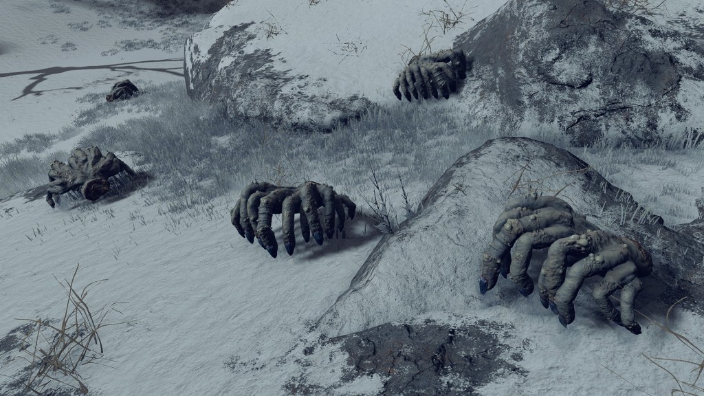 If these are the products of Marika’s experiments, then her disrespect for the dead — particularly heretics — is to be expected. We come across more Creepers upon the Giants’ Summit in the Mountaintops. These enemies are unique in that the larger variants wear no rings, magical or otherwise; we also encounter particularly ginormous ones among the bunch. From the location, these Creepers were likely sourced from the resident giants, specifically their frozen corpses — not like their crumbling figures would miss a few fingers. In short, it wasn’t just the great serpent used for finger experiments. This research is unlikely to be the work of the Fire Monks watching over the summit, given the mundane results doesn’t advance their incantations. But the only other party with free access to the Mountaintops, let alone the summit, would be the royalty who forbid them. Therefore, Marika is the liable culprit, conducting these and the other experiments at her capital in order to better understand the Two Fingers.
