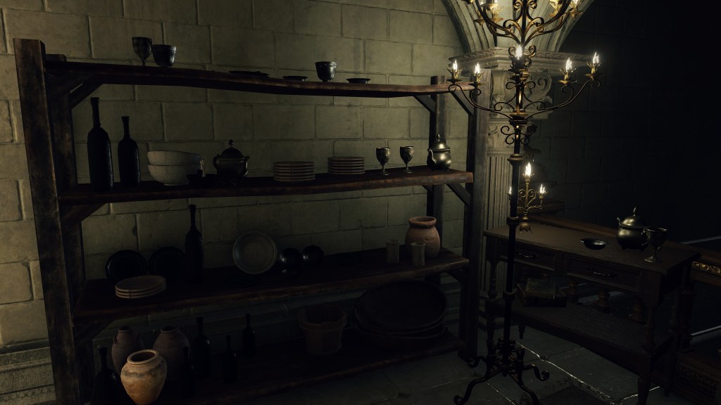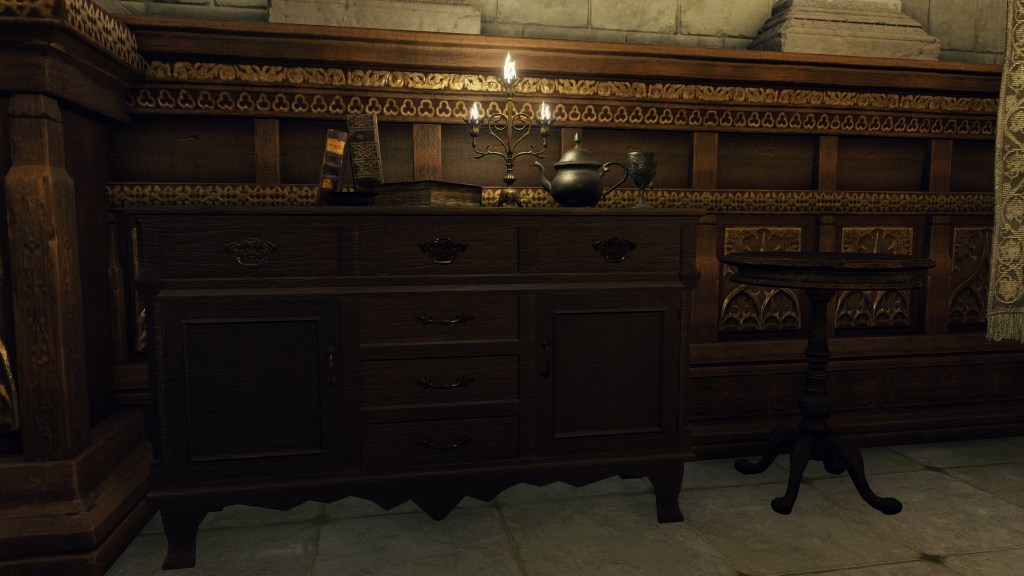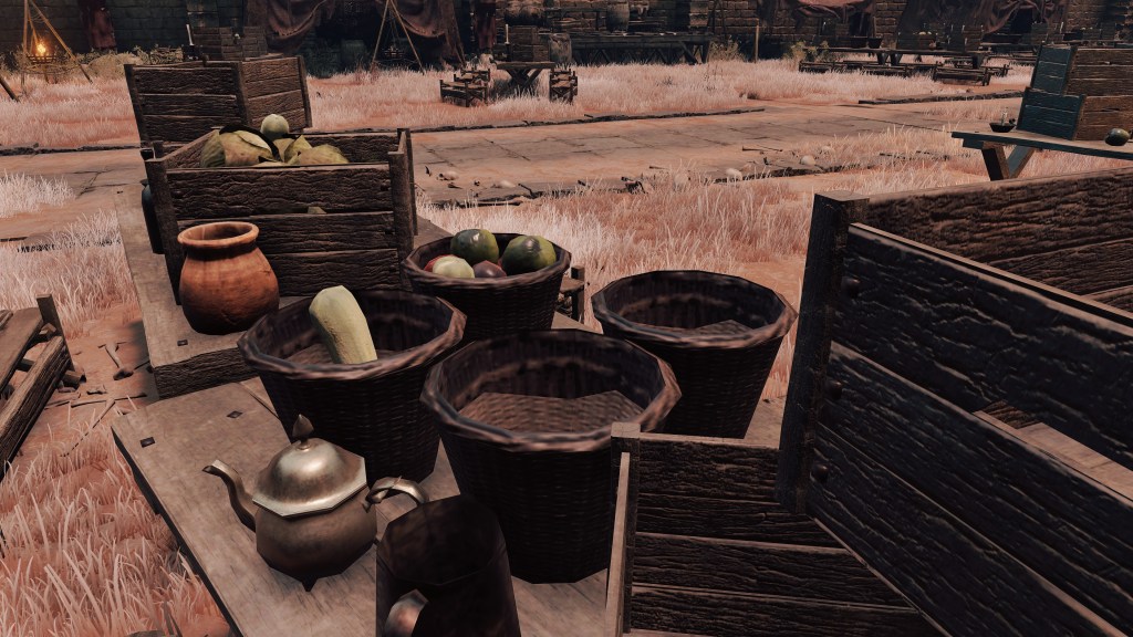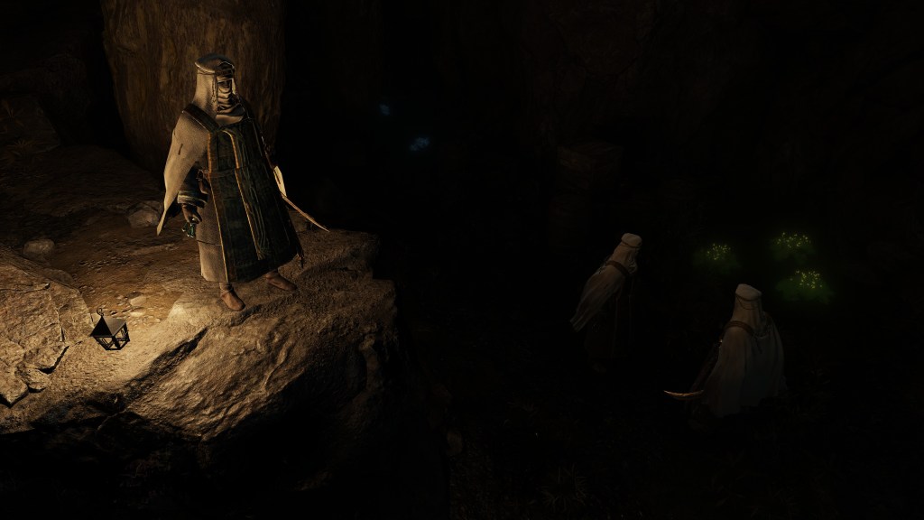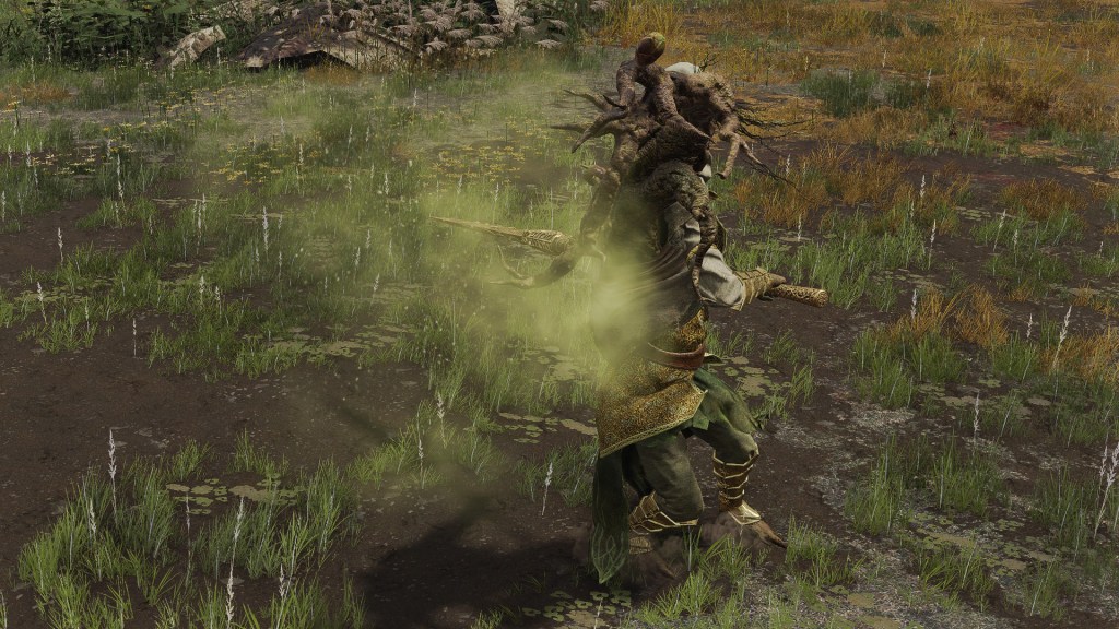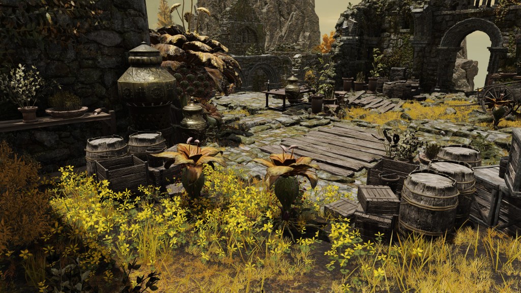Such surreptitious movements limited to the heartland explain why perfuming was kept within the priesthood for so long. The clergy presumably employed some sort of apprenticeship to pass on their secrets. Under another’s tutelage as an assistant, those who mastered the apothecary arts were eventually handed their own thick aprons to wear, the weight coming to signify their pride in the heavy responsibility of their remedial duties. The prestige must have contributed to the perfumers being so highly protective of that knowledge. Indeed, their peripheral facility is likely in ruins for fear that calling in people for regular maintenance so far and away from the capital would cause its existence to be leaked out. The single conscripted citizen standing lookout at the fringes of the property is similarly a clear attempt to avoid drawing attention — heavy security would also risk leaks. Nothing was to jeopardize the small elite chosen to serve god in reading, testing, and recording the powers of flora for the Erdtree.