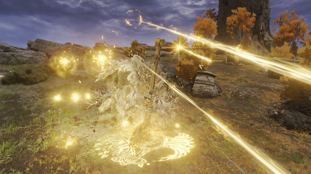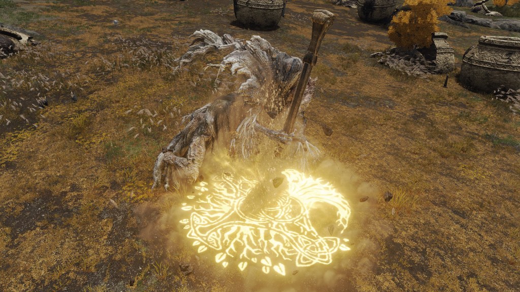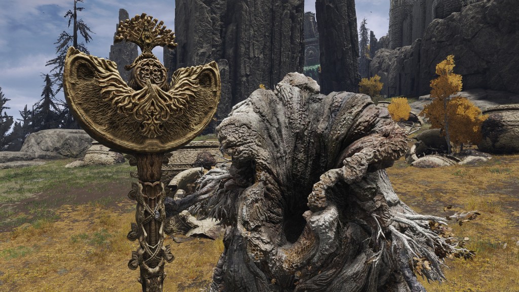 Onto the Crucible question: as incarnations of the local tree, the avatars sprout yellow leaves and possess the same golden power, which they channel with their staves. Naturally, the ceremonies performed with those magical conduits, such as Golden Slam, function like holy incantations and draw upon faith. Likewise, although the Erdtree Avatars don’t arise from the Minor Erdtrees until the Shattering, their staves are modeled on the Erdtree “of old” and used to also cast Golden Land. This affirms that the power well predates the modern avatars. In fact, the weapon skill suggests that the ground these lesser trees have taken root upon has been infused with reddish gold specifically. And where would that power originate? From the seeds the Erdtree had sown. Despite the avatars appearing long after the Crucible was defunct, both the Erdtree and its offspring possess reserves of the old tree’s power, evidently only used for emergencies.