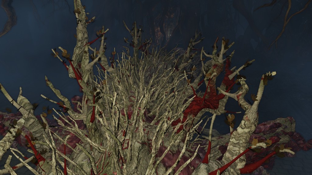 All the tree growths have a green sickliness creeping up from the base, holes further up occasionally expelling a poisonous gas. Something in their bodies is being processed as a hazard to remove — what is made obvious by the resulting blooms. Logically, the flowers are the color of blood because they are derived from blood. In short, it is the biological material which makes the guardians humans that is being broken down and excised, leaving only the plant elements. They are, as the blooming garb’s description insinuates, halfway through the process of becoming another Erdtree, hence wearing this attire empowers our healing flask while leaving us more vulnerable to fire. The guardians essentially agreed to become seedbeds, a bomb ready to go off the moment a tree was harmed in any way. If not for them kneeling to the Erdtree even now, this eternal watch might be considered a curse. Either way, they are still suffering the consequences of their choice to protect the golden tree’s future.