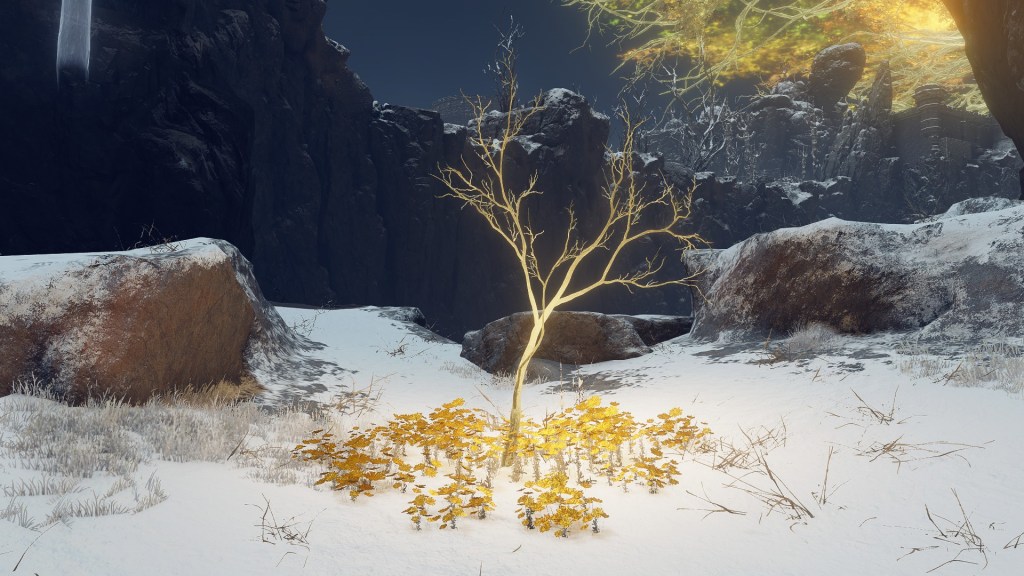 For an unpruned example, we need only look at the Minor Erdtrees. Like the phantom trees, these “small” golden trees exist all around the Lands Between. However, they have reached maturity, and well before the Shattering. They were already major landmarks during the Radagon’s reign as Elden Lord, given the Church of Pilgrimage erecting his statue maintains a dirt road leading straight to the Weeping Peninsula’s giant tree. Consequently, they must be the products of the first seeds sown come Crucible’s end. We see this demonstrated in the effects upon their immediate vicinity. Growing around the Minor Erdtrees are the same golden flowers, the small species appearing in most areas while the larger variant is exclusive to the snowy Mountaintops. Perhaps the trees are just desperate to express their nature, but the phenomenon nonetheless reinforces a connection between the grown trees and their smaller counterparts. Left to their own devices, the phantom trees will mature into mini-Erdtrees.